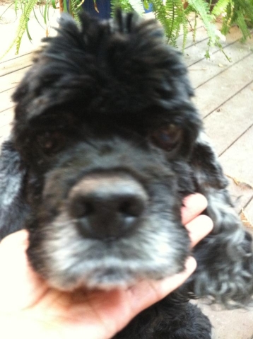 of her holding the chin of her dog Frida, I at first saw a dude, maybe an image of John Lennon, or maybe some kind of post-Warhol Mister BrainWash type image, of a human with sunglasses looking off to the left, in semi-profile.