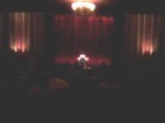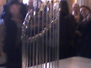 Here are three recent snapshots, which I hope to describe in considerably less than three thousand words. I chose them from a recent set somewhat arbitrarily and only now am figuring if and how they are related. The first features the World Series trophy, that was on display last month in the lobby of War Memorial Opera House in San Francisco, in honor of the Giants winning the 2010 fall classic, and a simulcast of “Turandot” to fans at the ballpark. The second picture is of the organist at the Packard Foundation’s Stanford Theatre in Palo Alto; he plays standards and “As Time Goes By” between shows. I slugged the third photo “AaronHomers” because I was watching baseball on tv when I captured the image. It promotes “The Simpsons”‘ Halloween special which airs tonight, making this entry somewhat timely. My tag references the baseball great Henry Aaron whose name is a homophone to Aron Ralston the man whose arm was pinned under a boulder famously, the basis of the movie “127 Hours” which “The Simpsons” are parodying. Not sure how it fits but Homer Simpson is actually a reference to Nathanael West’s “The Day of The Locust” about celebrity and modernity, and the rapacious nature of a crowd. I sent the trophy image to my cousin Ryan Moats who had attended in person the historic World Series Game 6 in which his beloved Cardinals baseball team staved off elimination, like Mr. Ralston. The Stanford Theatre will never show a James Franco movie in David Packard’s lifetime, but they did show Andy Griffith in Budd Schulberg’s “A Face in the Crowd” if that is an interesting comparison. Also, whenever I hear the music in there, in their Wurlitzer, I wonder how someone like John Medeski or Wayne Horvitz would fare giving the thing a soul workout — again, not likely to happen.