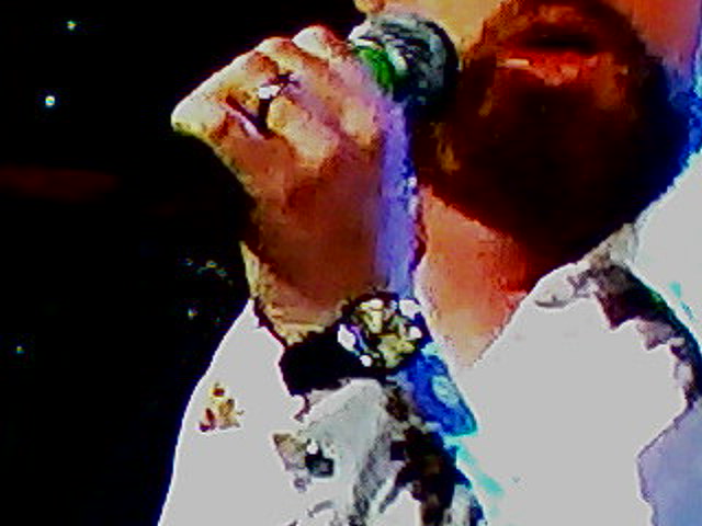 I counted 22 beats from John with the VibraSlap, the pseudo-Latin percussion device modeled after a donkey’s jaw. Once each after stanzas two and three, then a pattern of six, then a burst of 14 going out.