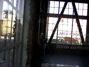 Later, in chapter ten or twelve of my adventures today, I briefly met the artist Carol Selter as she was apparently documenting her own science-and-nature themed-show at Gallery 16. I name-dropped Tony May and added the important fact that he and I share the upcoming birthday of January 28. Then I shot the ultra-sneaky snap of her from outside the gallery, on the steps looking back in.