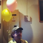 My photo of Mia and Rob is somehow stuck in my stupid cell, but Rob’s picture of me, next to a piece of his that sold to a local super duper architect, and featuring some balloons donated by the super duper nice people at The Balloon Lady — is that Dogpatch or Sunnyside? — came out, so to speak. They actually donated a cool frog balloon but in my best clown moment it lasted less than two minutes at Caffe Centro before I fed it to the ceiling fan.