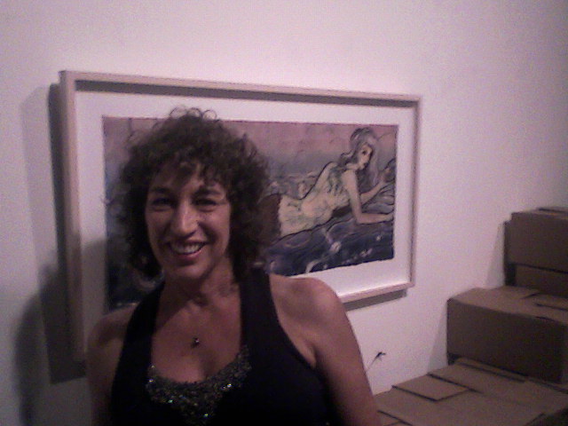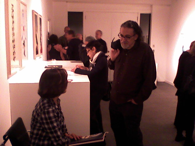 Stanford professor and artist Enrique Chagoya chats with Palo Alto arts commissioner, Stanford affiliate and artist Terry Acebo Davis at the Fall, 2011 opening of "the Tattoo Project" which is on display at Santa Clara University.