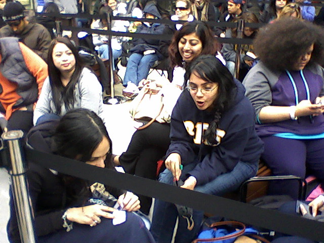I met at 9:15 a.m. three young women who said they had been waiting in line since 2 p.m. the day before to score tickets to the Maroon 5 appearance sponsored by the large corporation’s retail outlet’s grand opening. Their names are or were Swasti Shukla, Vidya Ramesh and TeJashi Pradhar, all apparently from Cupertino, California, about 15 miles south of here. Swasti said she was a B.U. grad –like the semi-fictional “I’ll show her” ex-girlfriend of Zuckgoldberg — and studying for the bar exam, and an English major, as I was, back in the day (we used Old English, in Shapiro’s Marlowe class, or Latin in our discussion of Hollenshed, but I digress). Vidya had a hoodie with Greek lettering, not for her sorority but for an engineering fraternity; she has a bacherlor’s from UCB but is now at Stanford, the campus, not the real estate / retail ground leasor, excepting these last 20 hours or so. I took the opportunity to hip them about Rupa Marya, which one of them conjured to her supersmart/GetSmart hand-held dohicky, of unclear corporate origin. Their wristbands revealed them to be number 80 of the Hot 100, the ones who scored two tickets apiece for Saturday’s big show, which will be on the roof or top floor of the adjacent parking structure. The lot looks to hold 1,000 cars per floor, or about 5,000 people, although the show is allegedly limited to 1,000. And although I was able to scam my way to a special viewing box for the ribbon cutting, thanks to this here little blog, the helpful event worker emphasized that my laminate will not do Jack Shit on Saturday. (We’ll see…)