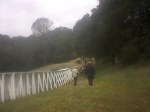 And there was the boat made of white wood planks…and the uh, hull of the upside down boat — did I mention there is a ladder, a white ladder, in the tree? — has a little silver pin in it, put with permission, and this pen represents the point on which the two cement walls from the house on the hill would meet.