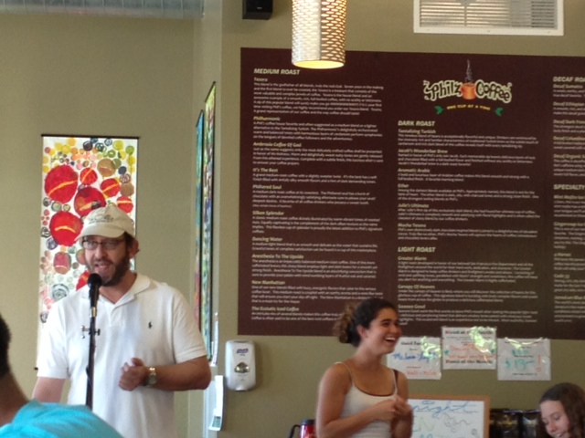 Mark Weiss at Philz Palo Alto downtown in May, 2012 doing his Harbaugh bit while the lovely and talented duo of Remi and Chloe wait their turn to sing that song that they used to know.