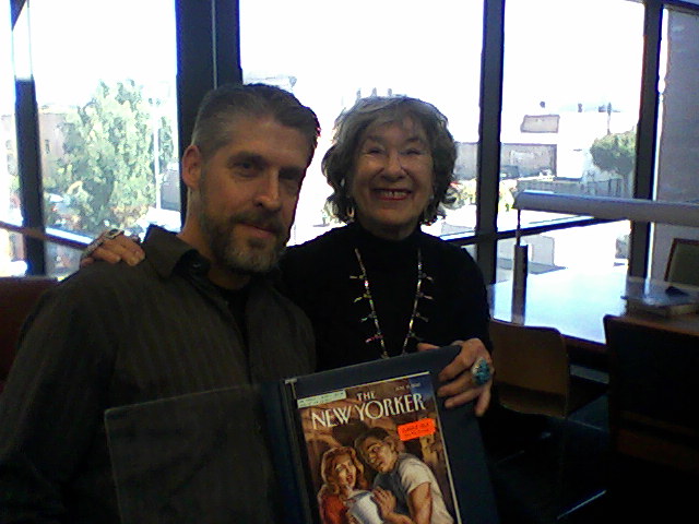 Terry and I went to Albany one Sunday afternoon to greet Santa Fe painter Mateo Romero but an added bonus of the event was meeting Albany painter Owen Smith, who happened to create the cover of The New Yorker the week before. Mateo and Owen are both featured at the library thanks to curator Ruth Belikove, pictured above with Smith. I had been reading about Owen Smith in the Chron.