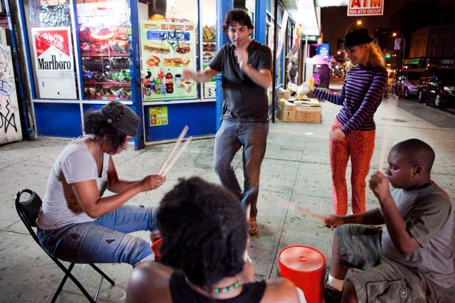 Nellie McKay (standing, in red pants) and four other musicians or mere humans pretending to be musicians, in “Downtown Express” a film.