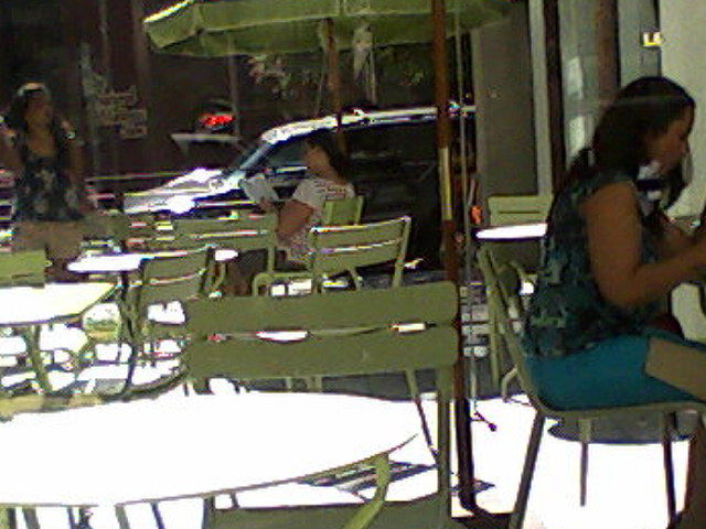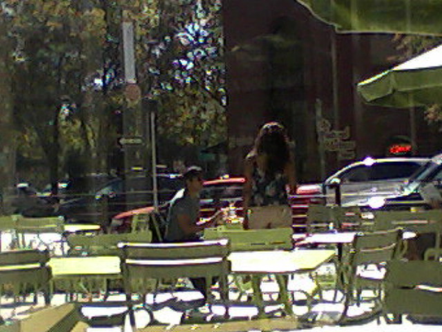 Eighteen tables and fifteen people, comprising “Five Tables At A Cafe”, the article referenced three types of shots in “Einstein”, close-up, medium-shot and something the scope of which compares to the fact that Wilson grew up in Waco, Texas. That triggered my impulsive intrusion into the lives of my fellow Cafe Society members. Coinky or not, the last group, in the interior section where I was, left directly after this shot. I was shooting the couple against the window; between them you can see what used to be the entrance to the famous social media social network company, for what that’s worth -less than fifty billion dollars I would think.
