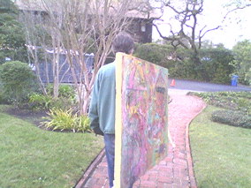 Maybe this is part of his Paul McCarthy training, this walking around the historic San Juan Hill on Stanford campus with one of his better finished canvases.