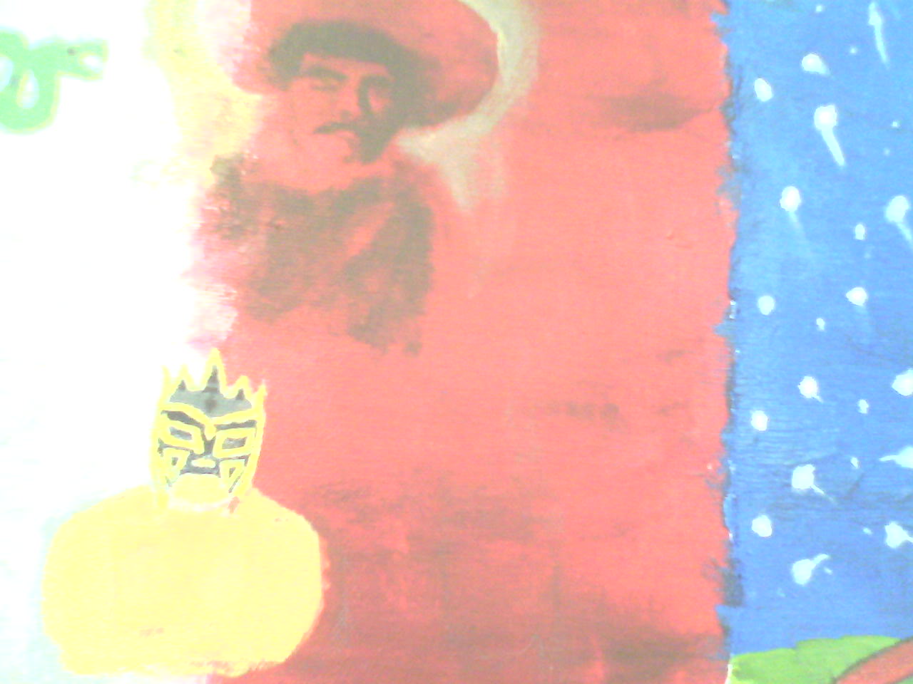 The work pictured above, a detail from a piece that depicted a Mexican tricolor flag morphing into Old Glory, with little vignettes, reminded me of Enrique Chagoya and the Orozco murals.