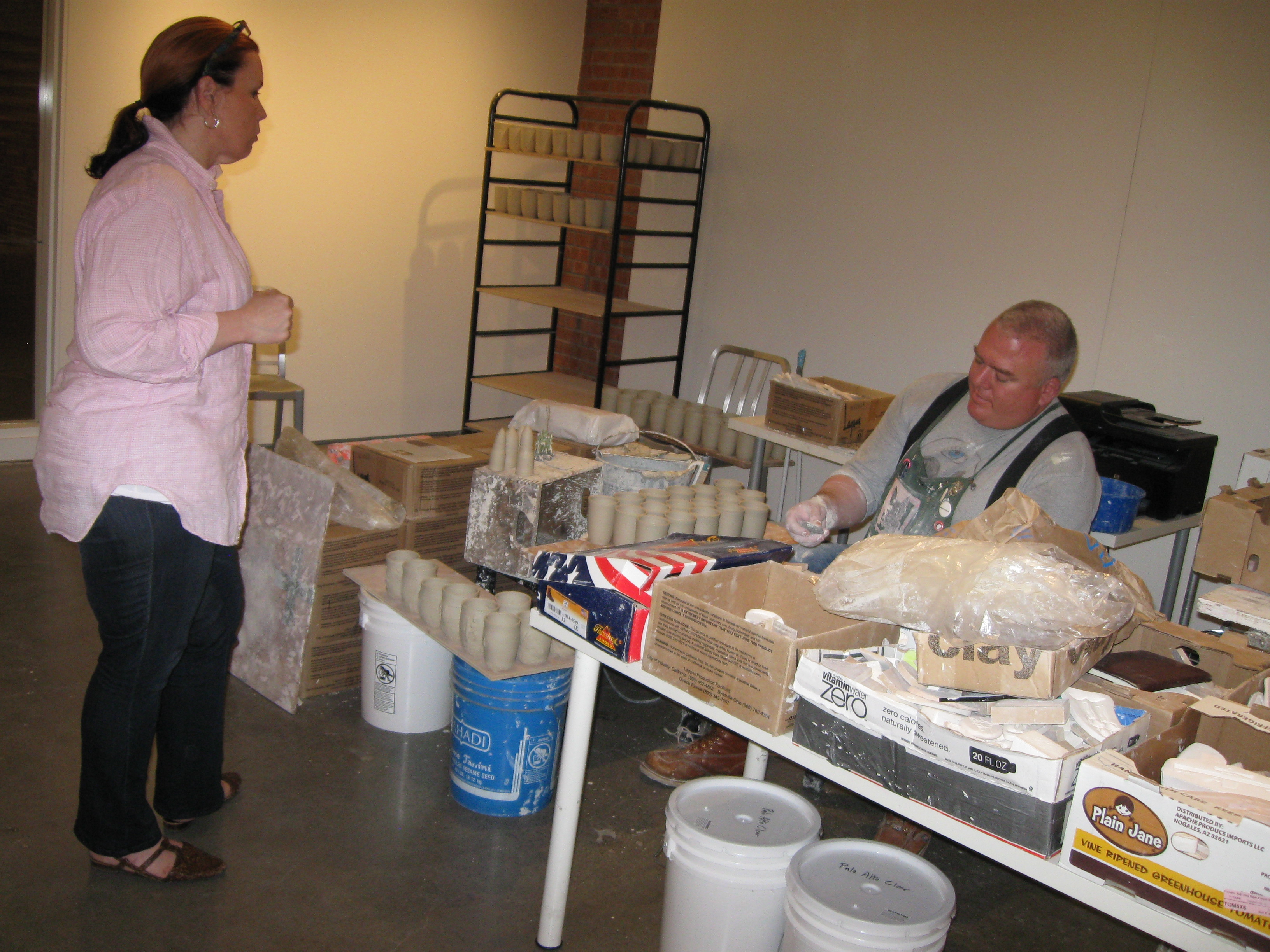 Ehren Tool is in residence at Palo Alto Art Center, creating a body of ceramic work that pertains to his service to our country, as an MP, in the Gulf War. He has created more than 14,000 cups that reference his experience. He gives them away. In Palo Alto, over the next month or so, he is adding another 1,200 cups to the project. I visited with Ehren for about an hour yesterday, watching him work and interact with his fans and the merely curious. Palo Altans have the opportunity to further participate in this project by providing content, most commonly photographs, that Ehren will work into the pieces, as decals or relief.