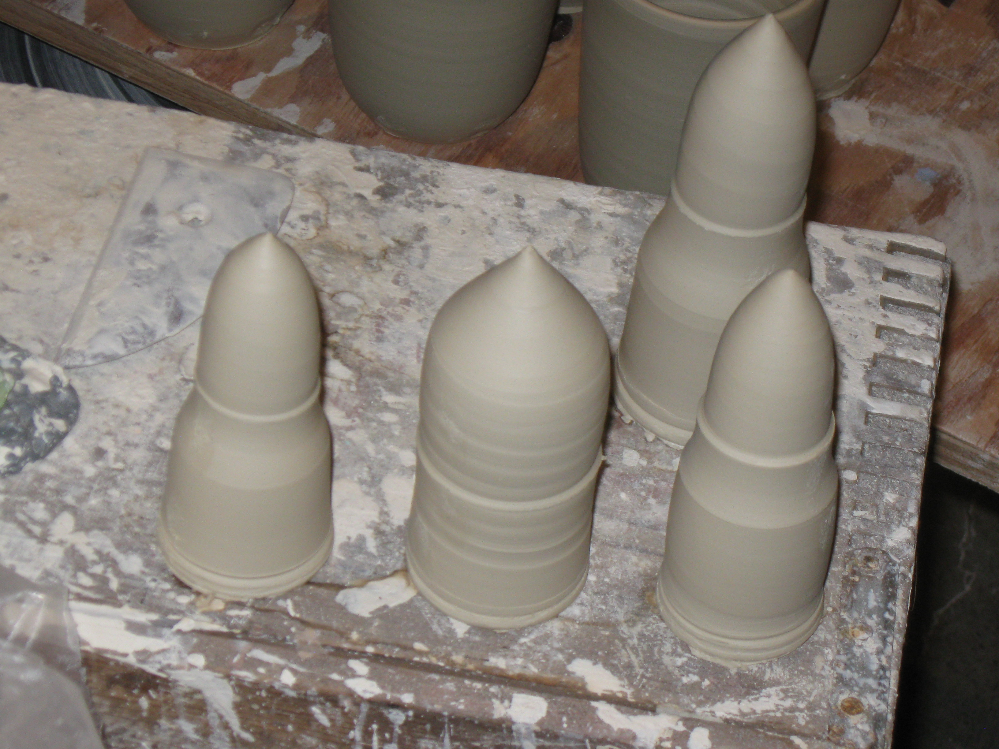 Shot glasses by Ehren Tool, not at all a homage to Giger. He starts with a 25 pound bag of clay, makes about 20 cups per bag, and then uses the last bit to form these bullets, so as not to waste.