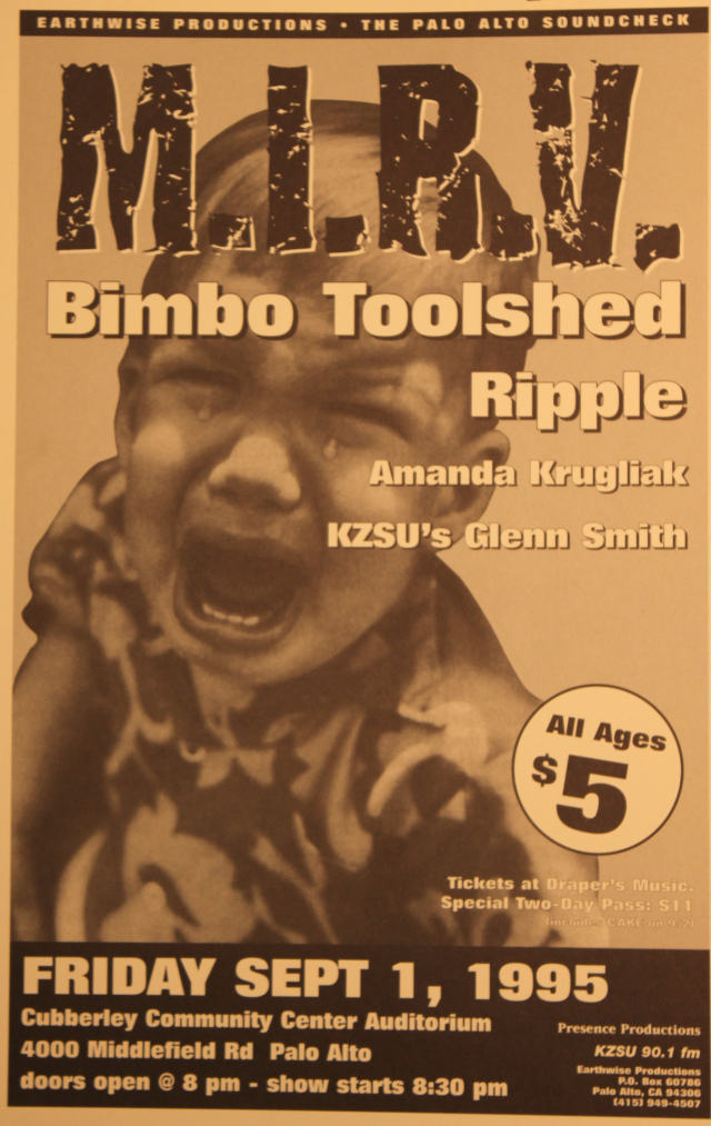 I think Mirv’s actual name is Mark. I know that his sideman or partner in crime (?) is named Brian Kehoe. I think their music is or way kinda surfy and humorous? They are or were friends of Les Claypool of Primus, who had an imprint at Mammoth called Prawn Song. I think Mirv or Mark is a South Bay native, as opposed to Les Claypool being East Bay, and a high school classmate of Kirk Hammett if you can imagine that. I do not know Les Claypool — if I stood three feet from him one night at Slim’s I doubt I was introduced. It is true that I wrote a grafitto in pencil on the wall of my bedroom, of my parent’s house actually: PRIMUS. I used to fantasize that that was how I would know I had arrived, when Primus played a free show or benefit, not at Cubberley but maybe at Rinconada or Mitchell Park. Anyways, MIRV is not Primus — I’m sure they hate it when people fixate on that connection.