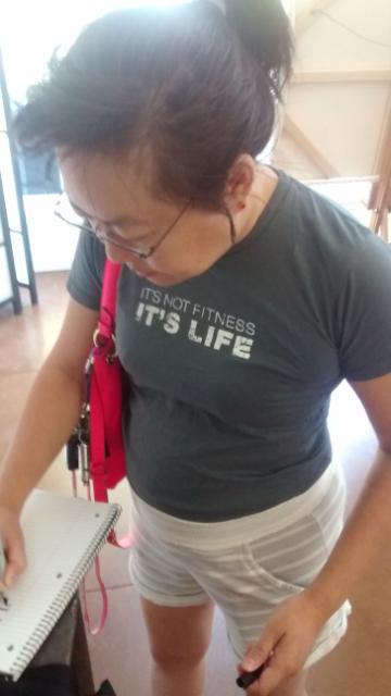 Bess Ho I first me at the music street fair Fete De La Musique I helped produce that year (with Claude Ezran, my former nemesis and now my soul-brother, despite the Harvard credential). She was playing a synthetic piano or something, via her phone. That was 2009, fall. Five years later I at least spotted her as a creative and said “ho” or “hey” but not “hey, ho” like in the video and she posed for a couple shots near her creation — a canvas — but I opt for this somewhat unflattering shot but more real; she is writing her name and number and some product information — high tech stuff that is mumbo jumbo or greek to me geek to me – in my spiral notebook. I just left her a v/m.