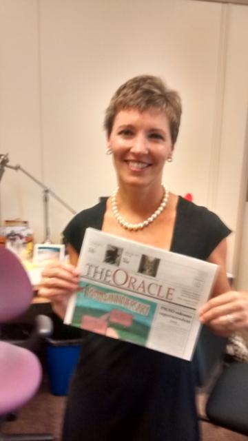 Denise Herrman, Gunn principal posing with The Oracle. First day of school issue. We did that, once. We including in this case the up-mentioned (mensch-did) Zlotnick and Elman and I. I just saw Denise at one of my top 3 place to caffeine-ate.