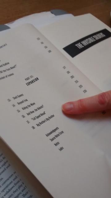 Reminds that Ann Hagedorn — and by the way I read four whole pages today of her “Savage Years” about 1919 with Woodrow Wilson on the cover the part about Einstein and Eddelman I think the Brit looking at the Solar Eclipse — says that in writing books the chapter titles become key; I took a picture of her digits the old school kind pointing at her title page in the Iraq contractors book. Worst or most subtle preview here, third attempt.