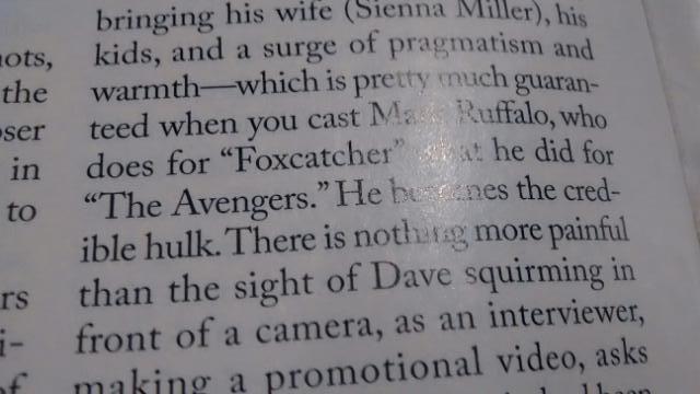 Steve Carrell probably deserves the academy award for best actor and does his rhinologist. Mark Ruffalo, who Anthony Lane in The New Yorker, calls the credible hulk — he was also in “Avengers” about comic characters come to life or such — was very good and I did not recognize him. He was equally good in “Twice” the sequel to “Once” about street musicians and their ambivalent couplings with the industry.