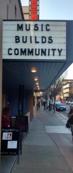 This is a sneaky portrait of one of the box office workers at Freight, but I was really going for the message on the marquee: MUSIC BUILDS COMMUNITY. The woman is adding calendars to a stand, at left. I cropped out a dude at right; sorry, dude. 4.