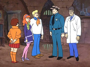 Every episode of the original Scooby-Doo format contains a penultimate scene in which the kids unmask the ghost-of-the-week to reveal a real person in a costume, as in this scene from “Nowhere to Hyde”, an episode of Scooby-Doo, Where Are You! originally aired on Septem