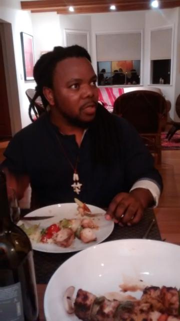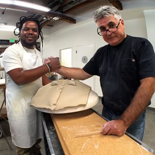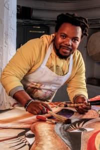 Andile Dyalvane, an emerging artist from Cape Town, South Africa, who works in ceramics and painted, scarified leather, is in residency at the Palo Alto Art Center thru August 2, 2015. He is producing a body of work in conduction with the ceramics shop steward Gary Clarien, some of which will be made for sale in the art center gallery. As a resident of the center, Dyalvane is available for students, collectors and the merely curious at various hours during his term, similar to the program featuring Ehren Tool in 2014. He led a masters’ class last Friday, and gave a lecture July 14. He has shown his work in Cape Town, Taipai China, France, Santa Fe, New Mexico. His native language is Xhosa, but learned English at age 18. He is founder and co-director of Imiso Gallery in Cape Town.