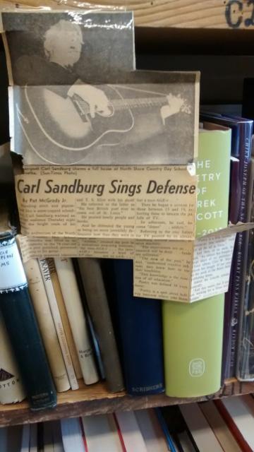 Item two is from something I shot a couple hours ago at Bell’s Books, a display in the poetry section, a newsclipping I presume found folded into an old book about poet Carl Sandburg giving a lecture or performance with guitar I think in Illinois. He died in 1967.