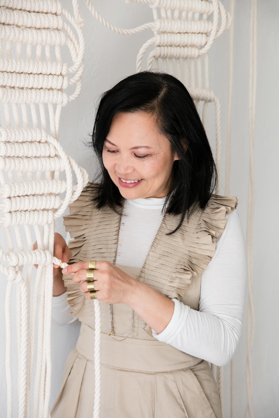 Windy Chien creates art out of knotted fabric, dare I say rope.I spotted her work or guess correctly at its source, at the new Verve Coffee 100 block of University Avenue. Her website reveals that she has graces the interior of the high end Cali Ave eatery Protegee which ironically enough is the first floor of the office building which replaced Keystone Palo Alto / Edge rock club.