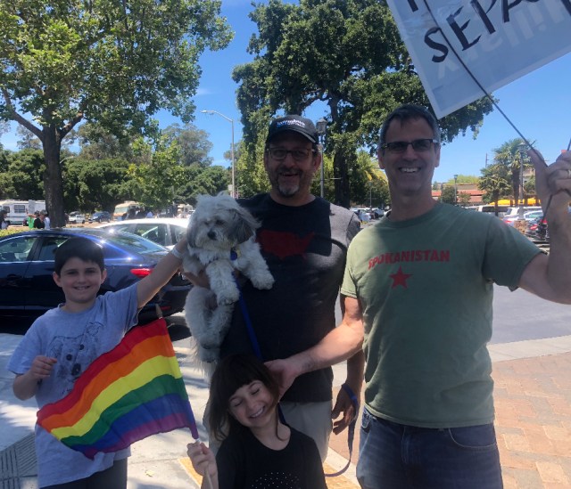 Earlier that day, I ran into Steve Almond his wife and two of his children, at Town and Country Village (El Camino at Embarcadero, kitty corner to Stanford Stadium across from the high school) seemingly as participants in a protest about the detainees at the U.S. border with Mexico. I actually had joined the fray a few minutes prior, after spending $64 at the bookstore and another $10 at the coffee shop. I was with my dog in one hand, or his leash actually, and a small rainbow flag I had bought the day before in San Francisco – I had marched in the Pride Parade. A uniformed guard from Forbes (not the magazine I don’t think) asked me if I was with the group. I took that to be a question of whether I was a protestor. I said “I’m waiving a rainbow flag and walking a dog, why?” He took my photograph and made some notes in a book and said that if I was a protestor I would have to get up the private property of Town and Country the mall and move closer to the street, where, in fact the vast majority of the others were. (On three corners, eventually). I tried to make a point about The Bill of Rights and than protestors also shopped there and he said I was making shit up. Then I saw Josh Becker the tech investor running for state office and I got him to stand with me and waive a sign and I chanted and the officer took note and pictures of Josh, too. I thanked Josh for humoring me and promised to donate $100 to his campaign. Maybe I will write the owner of the property and ask for permission to stand 10 feet from the curb and speak my mind. Later Duffy and I chatted up a protestor I had met previously and told her this story and then the Bar-Kays came on and I made a short vine of my dog — there’s a pun. My dog agrees with Chomsky that Everett is out to lunch.