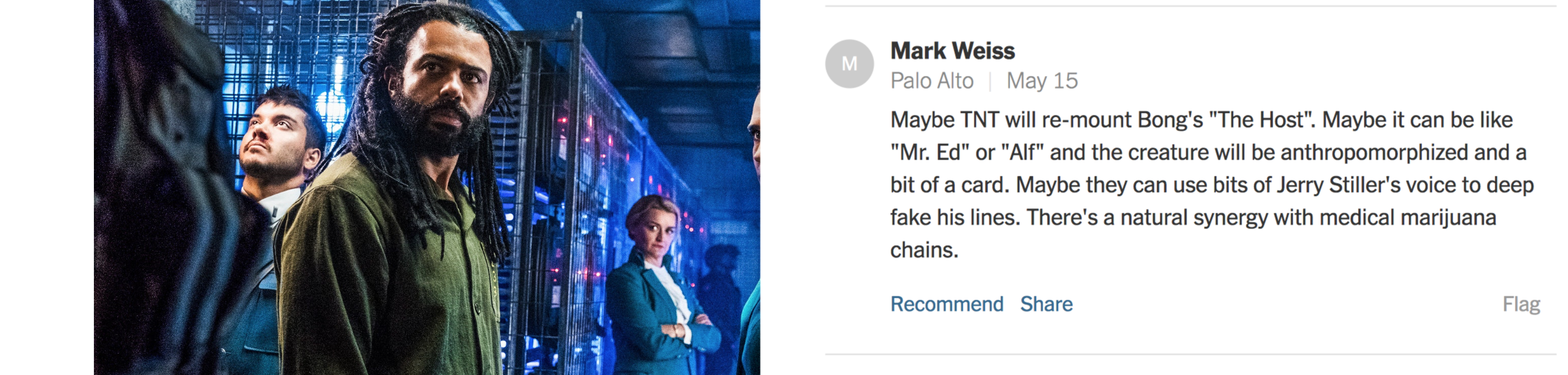Bong Joon Ho won the Academy Award of three of them for “Parasite” which I saw thrice, at Palo Alto’s Aquarius downtown. “The Host” which is a monster movie about distrust of government — in the way that “Godzilla” is about nuclear war — and it would be interesting to see it again in context of coronavirus. Which reminds me: I had posted to PAW and it was quickly deleted something that sought to link two threads, one about Tesla’s defiance of worker safety laws — separately Robert Reich was quoted as calling it “capitalism at its worst — he wants to put worker’s health sacrificed to profit” — and ramping up the testing — I suggested that all the tissue or fluid extraction was a presage to the story of “The Matrix” — how much blood do they need? I guess my suggestion would be randomized testing not billions of venipunctures.