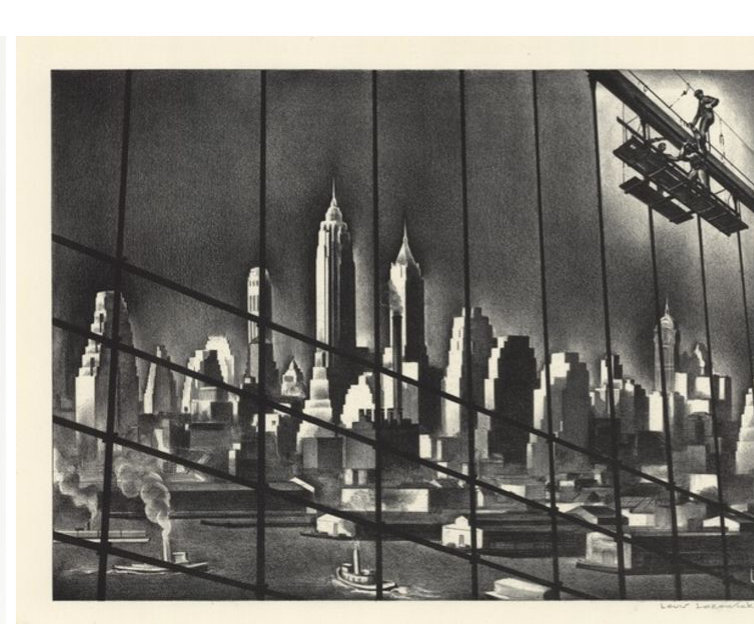 Louis Lozowick, p 173 Through Brooklyn Bridge Cables, 1938 Lithograph at Achenbach, 9 x 12 by the way its is definitely the suspense bridge I am keying on; and in the coda of the catalog a timeline with little illustrations including 1936 Bay Bridge Opens, p 228. Are there bridges in the show not in the book?