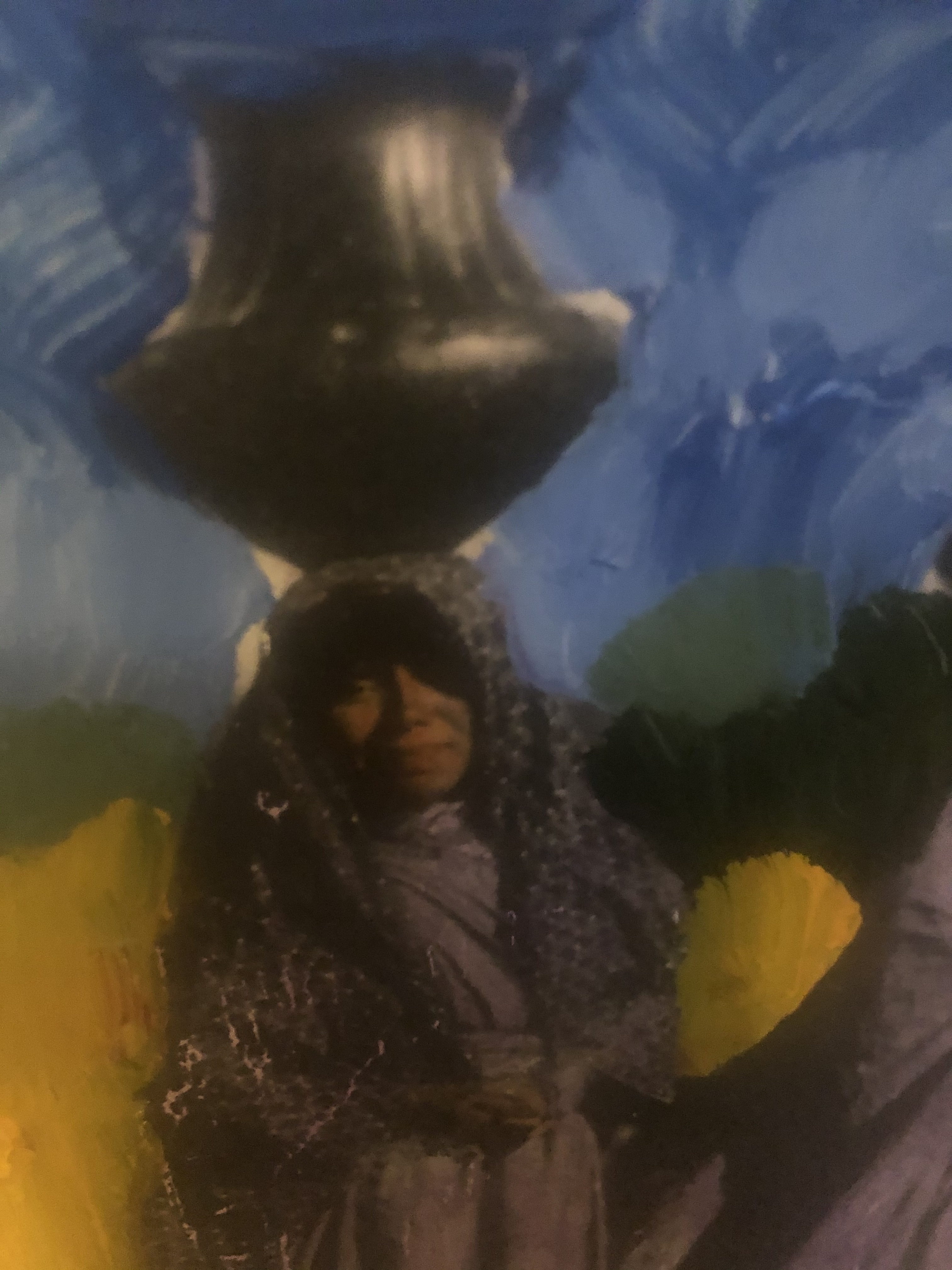 This is a painting or mixed media work by Mateo Romero of Santa Fe area and depicts a Santa Clara pueblo woman with a black pot on her head. It means that Rebecca, a Stanford grad with a Harvard law degree has a lot of her mind.