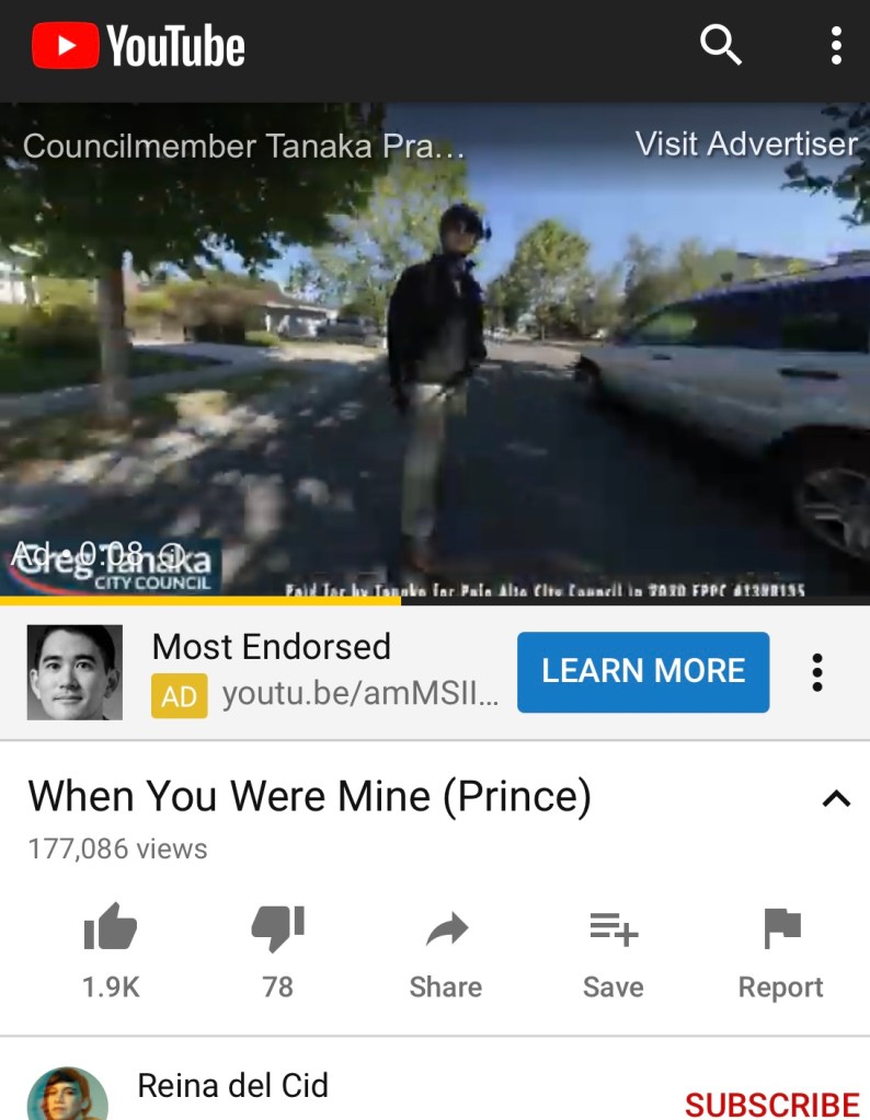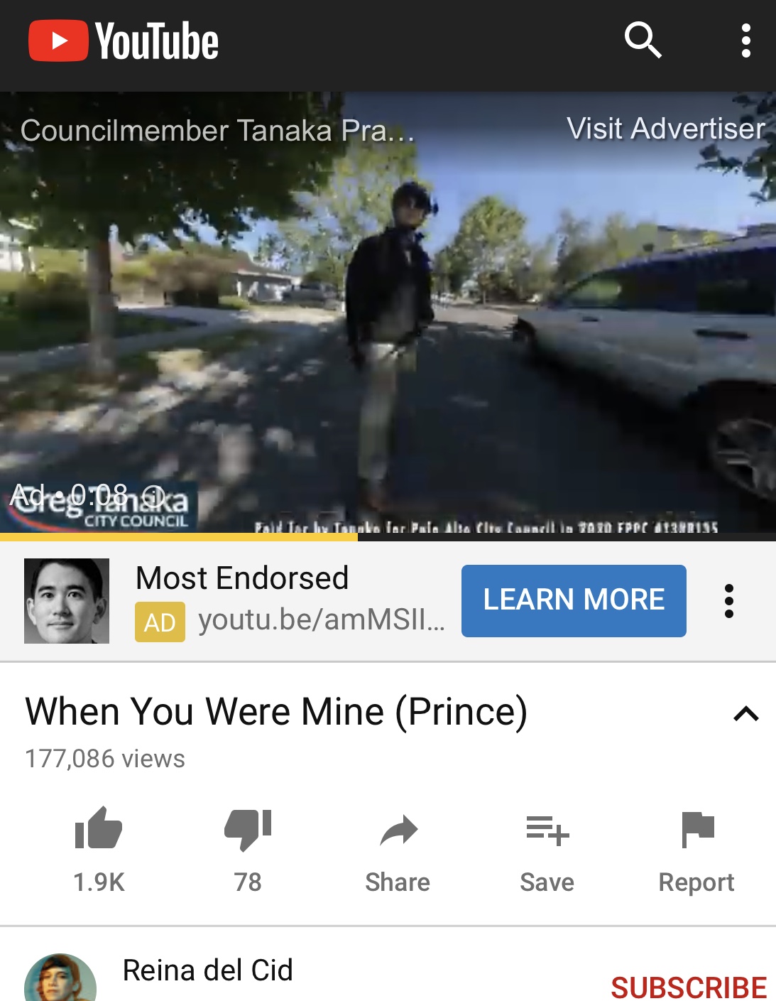Greg Tanaka -(-10 minus 10) Incumbent Greg Tanaka has not responded to the good faith offer to participate here, potentially win undecided music-loving voters but apparently has an algorithm that will interrupt my attempts to listen to Prince “When You Were Mine” by Reina Del Cid on YouTube and ask me for his vote anyways: