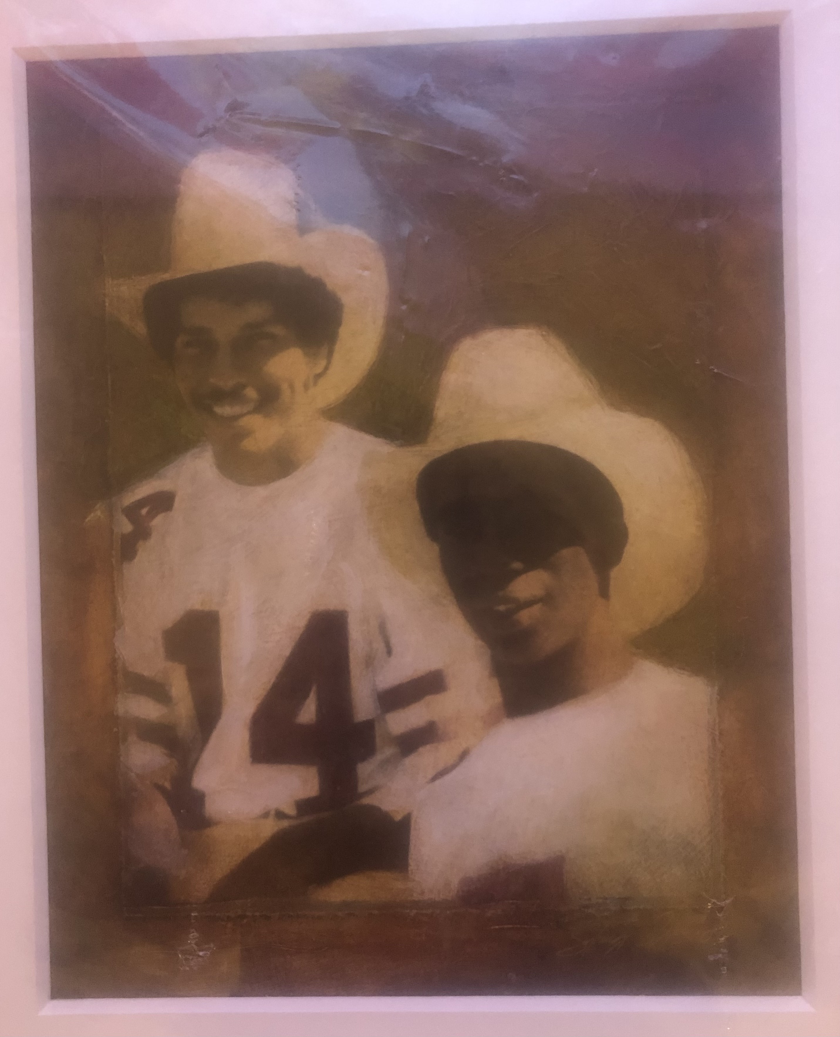 Edit to add, two days later: I’m watching NFL on a Sunday — both the Niners and the Raiders lose, but there is some solace in the fact that former Gunn quarterback Chris Strausser is probably having one of the best days of his coaching career in that his Colts have run for more than 200 yards. I’ve added this painting by Stacey Carter which was created in 2008 as part of the discussions of the loss of Danny McCalister, the former Gunn football and basketball star. The painting is based on a photo from the 1980 Gunn Olympian yearbook; it depicts Javier Gil and Danny McCalister. (Stacey had created a suite of realistic paintings for the Baltimore Ravens, and I commissioned her to paint something about Danny; the original idea was that Gunn would put it in the boys locker room or the library, as a memorial and to raise awareness about the fund).