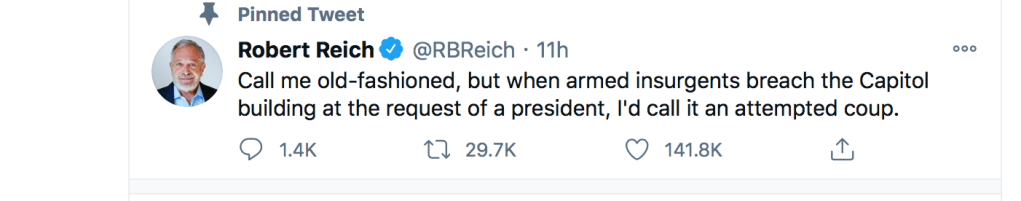 andand: thank you robert reich, my fellow dartmouthian, and jb pritzker, my former hebrew school classmate for your stances: this is a coup. there is a clear and present danger.