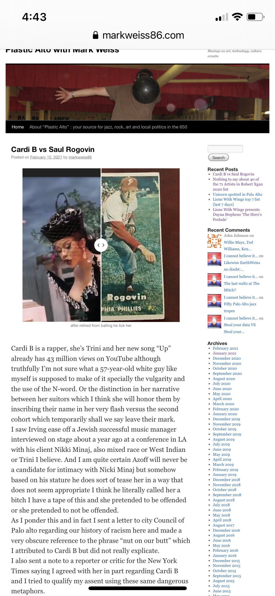 Mark Weiss, founder of Plastic Alto blog, is a concert promoter and artist manager in Palo Alto, as Earthwise Productions, with background as journalist, advertising copywriter, book store returns desk, college radio producer, city council and commissions candidate, high school basketball player, and blogger; he also sang in local choir, fronts an Allen Ginsberg tribute Beat Hotel Rm 32 Reads 'Howl' and owns a couple musical instruments he cannot play