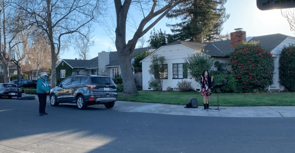 Nova Jimenez chose a quiet cul-de-sac in Palo Alto for an impromptu, COVID-era free performance last month (or so says the file, dated, February, 2021).<br /><br />She is an instructor in the music department at Stanford and has done more than 70 shows around Palo Alto recently. <br /><br />My rule of thumb is to play but not advertise, but that’s just me.<br /><br />Thank you musicians and artists for helping us through these trying times.<br /><br /><!– /wp:paragraph –>
