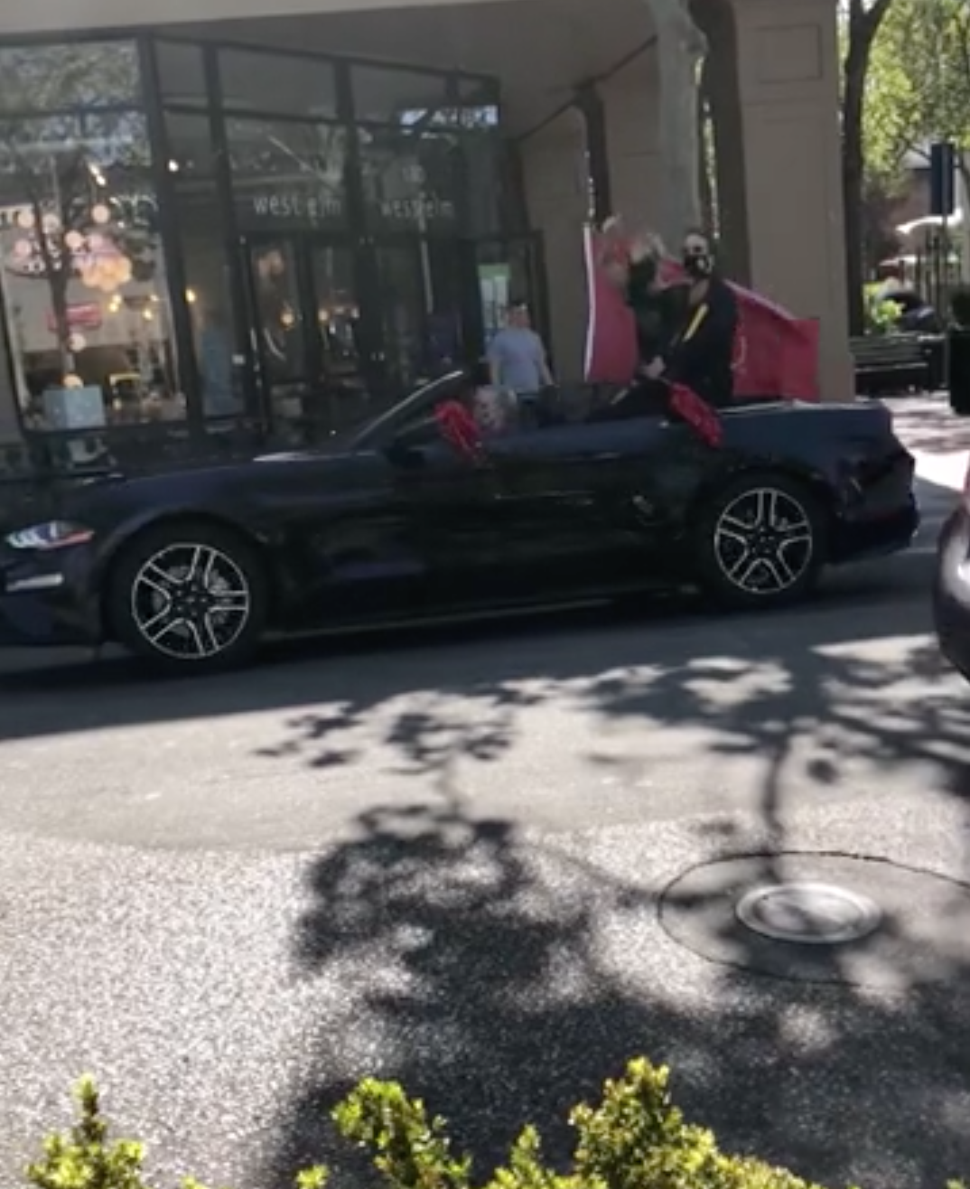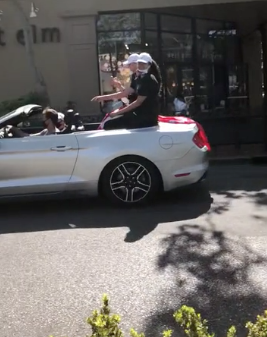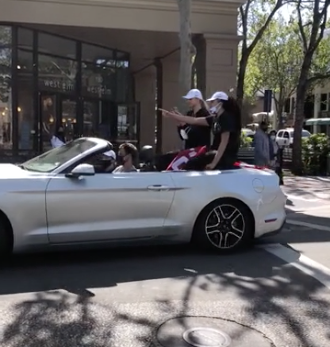 At first I thought the procession was for a fallen firefighter. Soon enough it dawned on me that this was a Covid-protocol social distance parade. I saw Tara Vanderveer with assistant Kate Paye, Haley Jones and others. Two or three replied to my cheers. Later I saw mayor Tom Dubois interviewed by KPIX 5 and Kyle Martin of the Post in front of City Hall. I sent the footage to Ann Killion and Scott Strazzante of the Chron, and to John Paye, the former Stanford star, brother of the coach.