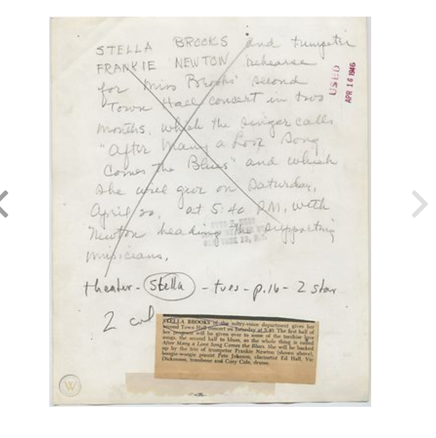Long story short: when I saw Stella Brooks’ obituary in the Chronicle, I was struck by her glare. Reading further baited me further. I sent a note to Deb Wright her niece and the keeper of the flame; meanwhile, the Palo Alto Weekly had a story about Kay Kosty, “Black Olive Jazz” who teaches drama at Stanford and fronts several jazz bands. Soon enough Kay and I called on Deb who showed us through a couple boxes of clippings, letters, photos and ephemera. On the way back to the Bay Area we brainstormed some ideas about how to combine our energies to tell Stella’s story. A short time later Terry Abrahamson and David Kaplan tapped us for how to reach Deb and mine that same box. There was a production in Massachusetts of “Jazz Funeral for Stella Brooks” at a Tennessee Williams festival. Terry and I had breakfast in Palo Alto. My parents died. I got married. I restarted a concert series in Palo Alto at Mitchell Park featuring vocalists like Jane Monheit doing mostly Ella songs. I had Beth Custer Clarinet Thing doing mostly an Ellington program on Mardi Gras. A plague descended upon the land. I hid in my townhouse for three months dying to live or living to die. I woke up one day and decided to use the internet to “make” “music”. I called Kay out of the blue. She called Noel Jewkes. Anyhow, she’s a little piece of leather don’t you know? Well put together don’t you know. What is? My brain? Lions with Wings? Earthwise Productions? The third rock from the sun?