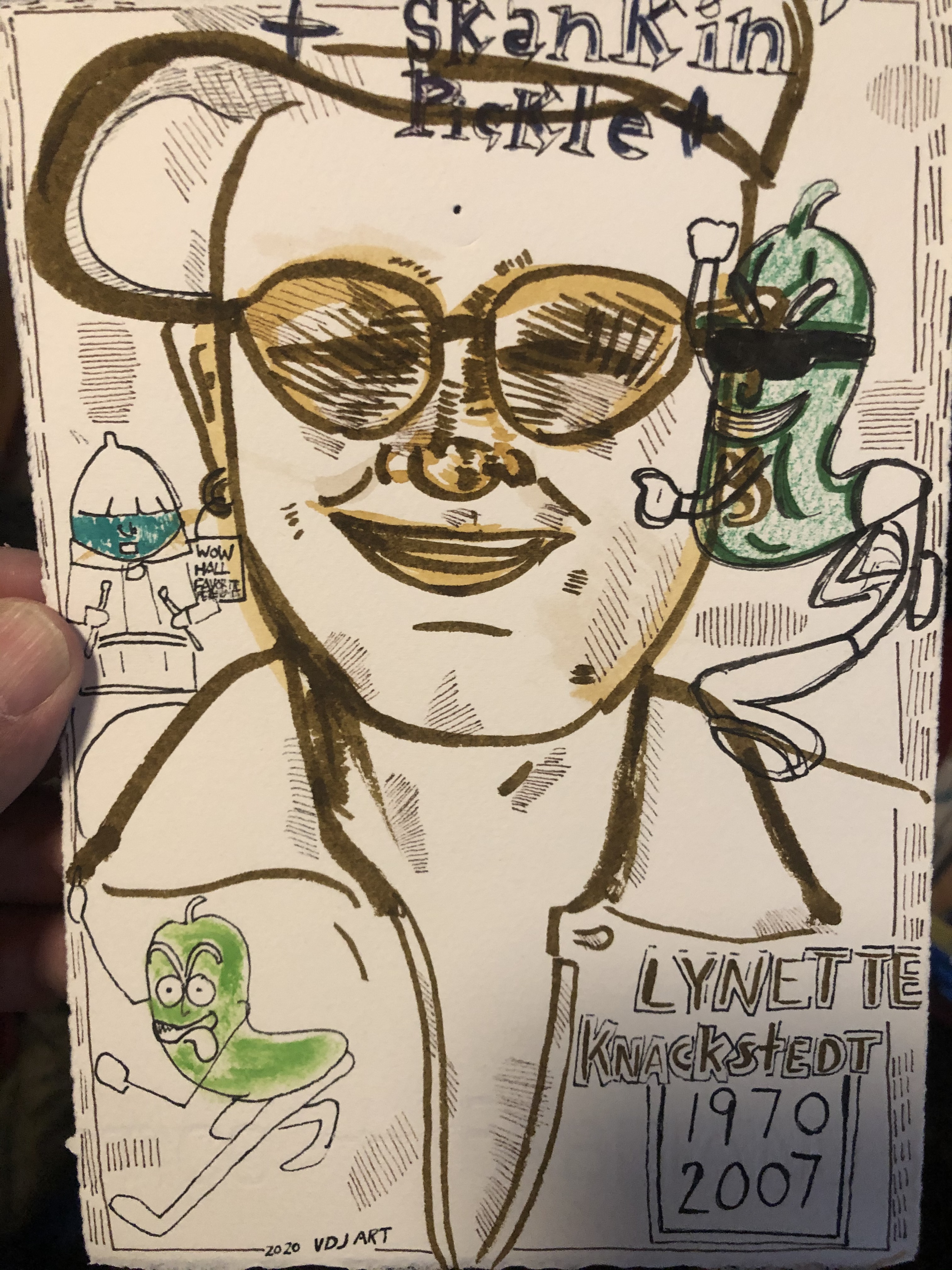 and1: One of the projects I did to stay busy, stay hopeful, stay sane during the Covid-19 lockdown in 2020 was to collaborate with Veronica DeJesus to do a series of memorial portraits of musicians who had played my concert series. I did not know Lynette Knackstedt and doubt I spoke with her at the show but she did play at Cubberley once, summer of 1997, my second Palo Palooza show. Aaron Carnes’ book has some passages about her, including a crush by another fan, which she handled gracefully even though she was a lesbian and he was straight. Maybe an author like Carnes should tell her story.