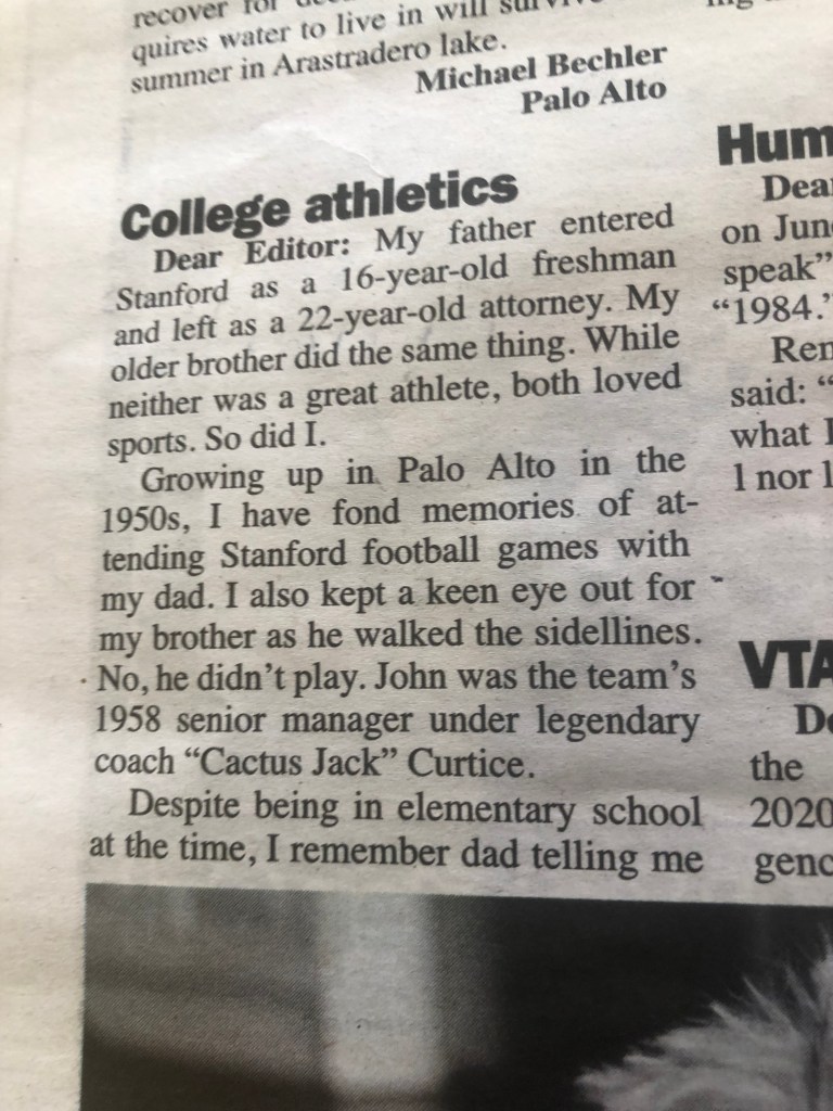 I disagree with Denny Freidenrich, who lauds the Supreme Court decision on paying NCAA athletes. If i were a college President I’d recommend dropping football entirely before having professional athletes represent the school and displacing students athletes. Denny’s brother was chair of the Stanford board and chair of their most successful capital campaign. I recommended “Freidenrich” as the name for what is now Greene Middle School. I don’t see the rules change as paying Jim Plunkett for value created I see it displacing him for someone more mercenary