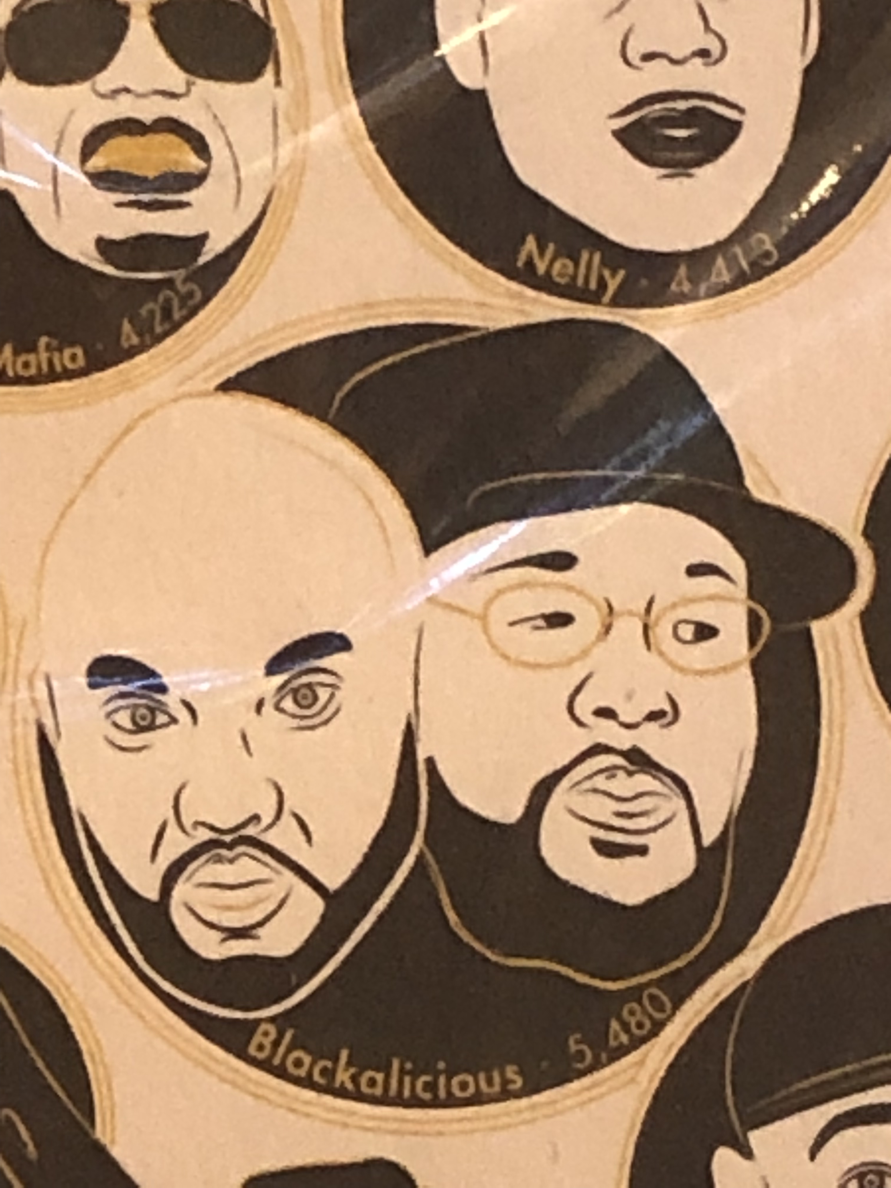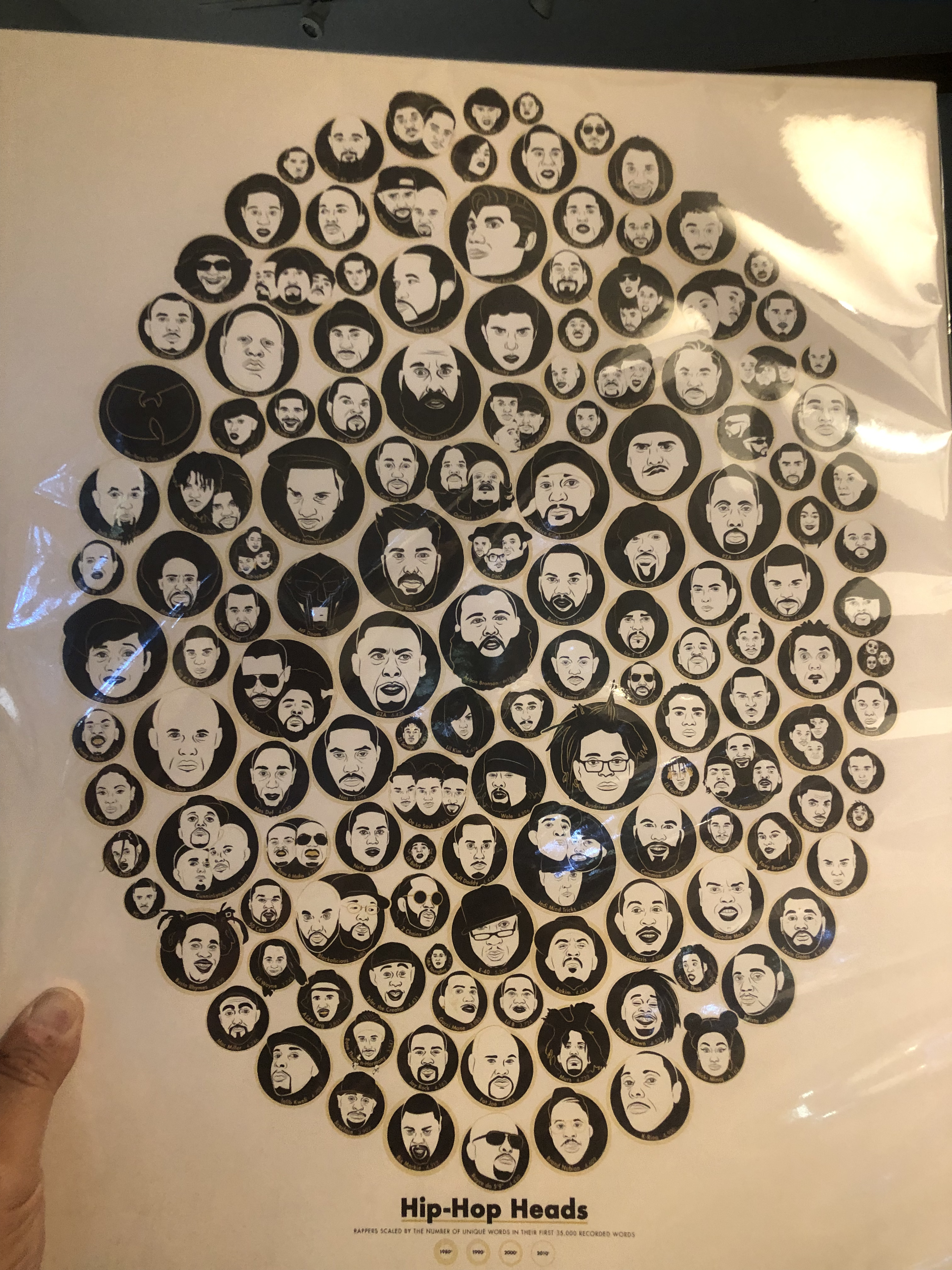 I bought this artwork called hip-hop heads from Gwen Crawford Gasque of Letter Perfect yesterday. It says it is scaled based on the number of unique words in their first 25,000 recorded words.