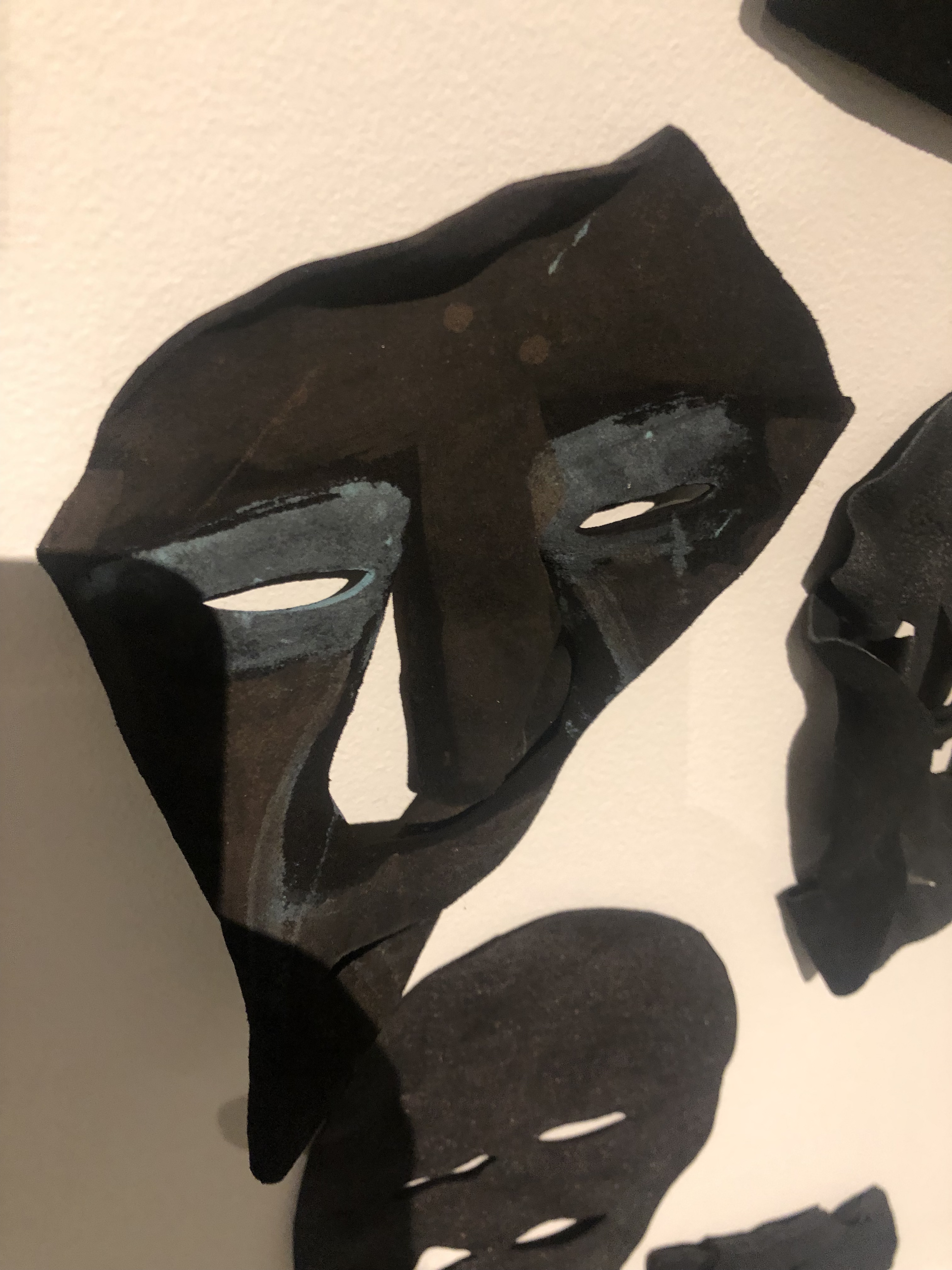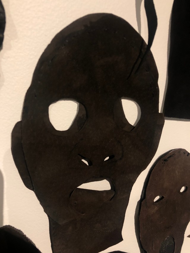 In Alicia Henry “Analogous III” (2020) acrylic, thread, yarn, dyed leather, an accumulation of cut-out leather faces creates a convergence of witnesses — (although I almost read that as “whiteness” – -since my name is Weiss and I both “know” and “white”) — a crowd of spectators whose expressions vary as viewers pass by. I counted the number of pieces in the installations in the show. There was one that was about 100 and the other about 200. In sum, there will be fewer people as audience members at my three-part concert series than there are pieces in the corresponding show, “The Black Index” – – in theory we can establish a one-to-one partnership between each person who attends the music and if they later or before go into the show and choose a piece. Each face maintains an individual presence, while taking its place as part of the collective. In the form of a monumental procession– a ritual that may be celebratory or mournful — the faces in (this show or this work – the actual word is too difficult to type just now — and my brain flashes to my junior high typing instructor Mel Froli who might be appalled at how degraded my skills are, all my bad habits) suggests a concentration of different experiences. For Henry, the spectrum of emotions they display reflects the complicated often contradictory ways in which we communicate with one another. She invites each viewer to share in the experience of community for a moment in time.