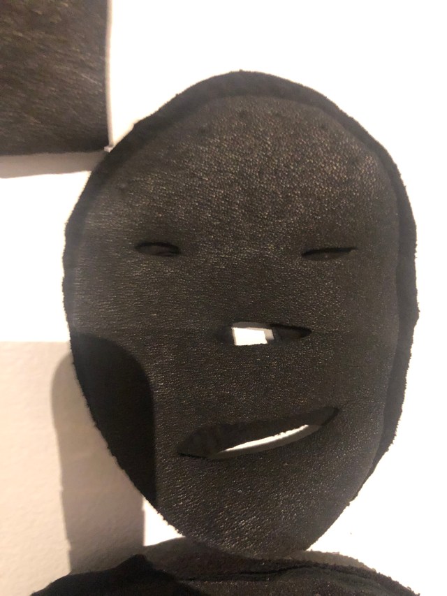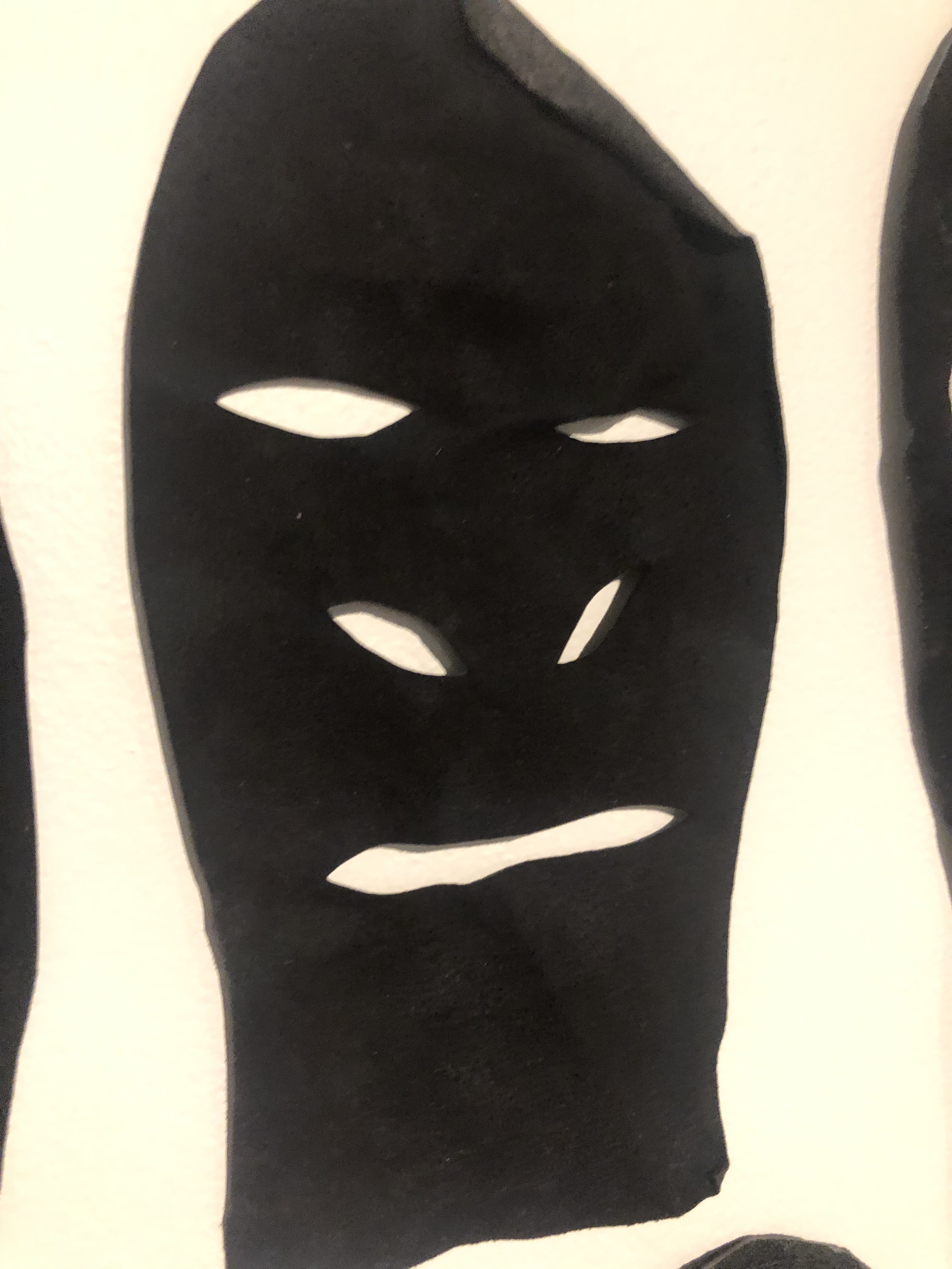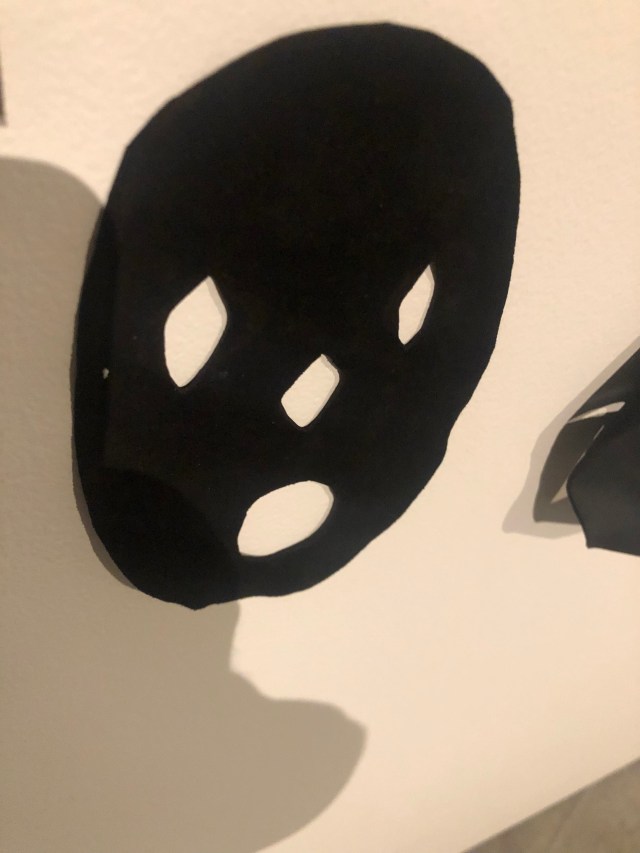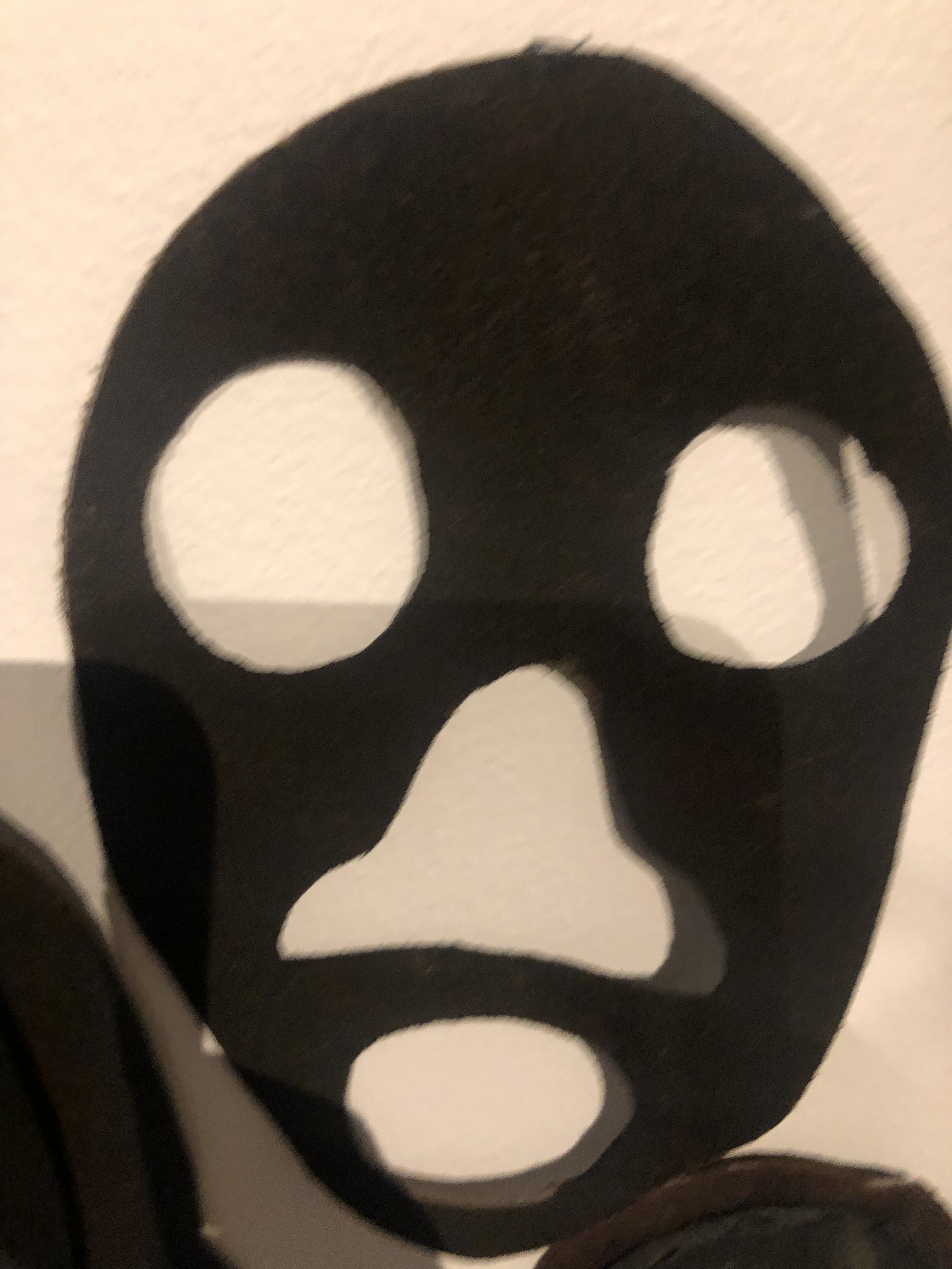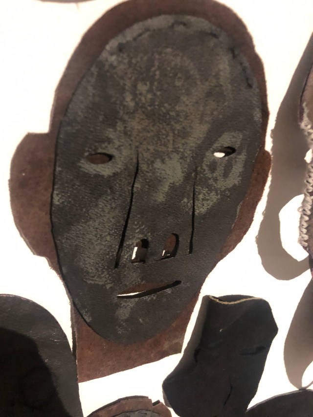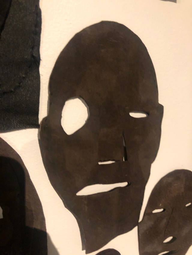 I am thinking of the actual names of those happy versus sad masks that symbolize theatre. Boots and Sachem or something. They were wearing socks made of sacks? There is some continuum or comparison between Alicia Henry’s leather faces, the coronovirus masks (for example, my collection by either Marine Layer which I call Marin Layer, Keen or Kara Maria) and those Boots and Sachems or whatever. And I am packing so to speak some blue handbills designed by Yuriko who I met at La Doña’s party for her mural.
