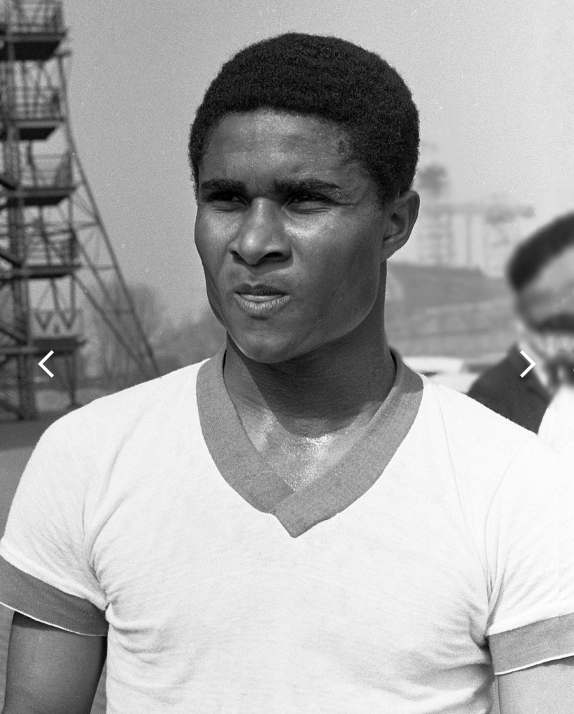 This morning I have a list of three chapters I want to read from the book “a little devil in America” by Hanif Abdurraqib. The first would be “I would like to give Merry Clayton her roses” which for me is also about my experience seeing the Rolling Stones concert and/or my experience working with Black musicians such as recently Gaye Adegbalola and David James. Two, “16 ways of looking at black face which includes four separate sections of “pretending to be Black”. Third, “on going home as performance” which caught my eye because it mentioned Eusebio pictured above. Briefly Eusebio was from an island off Africa that was colonized by the Portuguese and then played in Lisbon and was almost as good as Pele playing for Brazil and in their head to head meetings actually outscored Pele. Bill Rose the Palo alto filmmaker introduced me once to a soccer loving the singer from cape Verde who reminded me that I had read about iEusebio when I was 10 years old and just discovering the brave new world of sports outside North America.