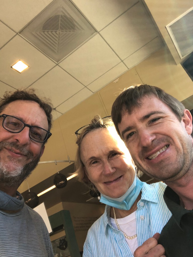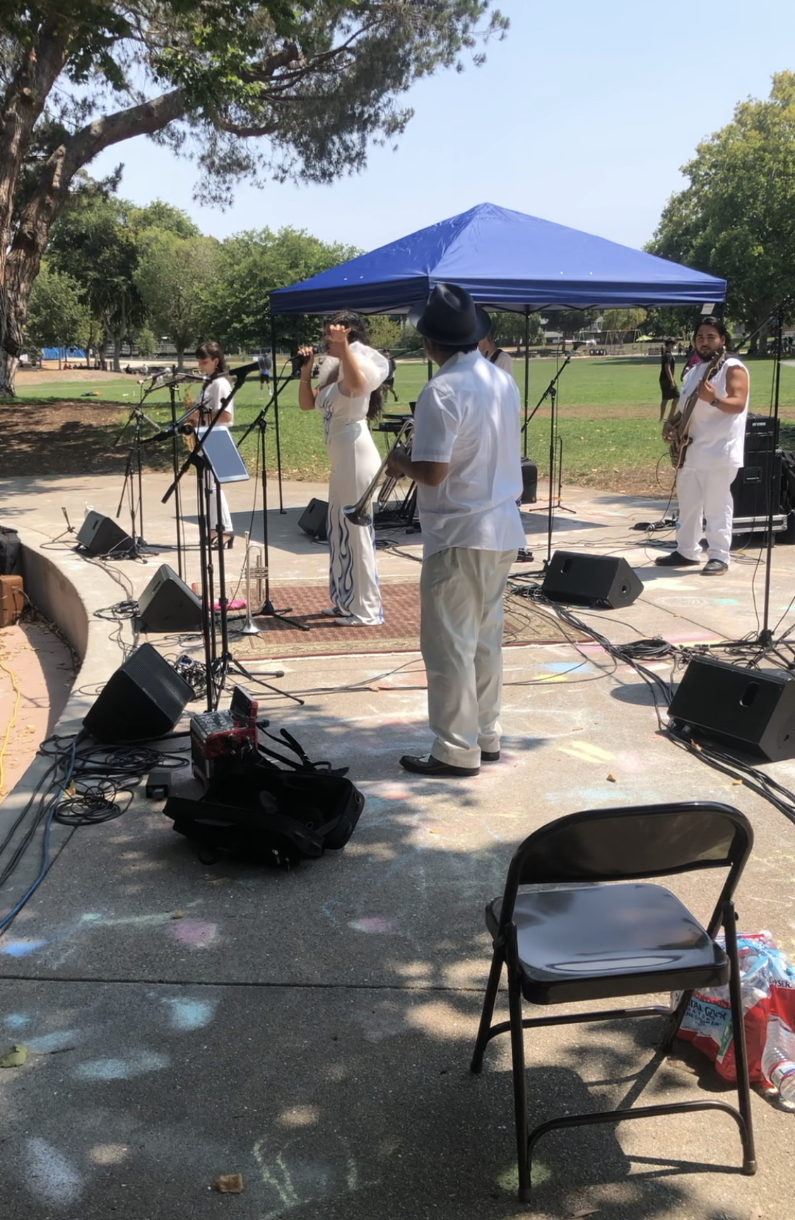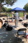 Kathleen Hughes and Charlie Hughes of Ada’s Cafe at Mitchell Park Center, and Mark Weiss of Earthwise Productions take una pausa muy breve after a banner day in which the cafe made 108 sandwiches, 10 of which were for La Doña Y Su Cuates, who played the nearby bowl. Earthwise hosts a two band bill, Vetiver and David James Mission Rebels next Saturday, from 2 to 5 pm. The City of Palo Alto then hosts a Twilight show at Rinconada Park with a special mystery guest.