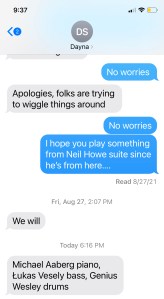 1) Dayna called to “advance” plus he re-sent his list of personnel, which I will add to the official site, whihc is EventBrite. Dayna Stephens, mind the spelling. He will play, he confirms, tenor sax and EWI, which is great for Silicon Valley: its a machine or gadget that simulates a computer playing a flute, yet you have to fidget with some wheels or what.