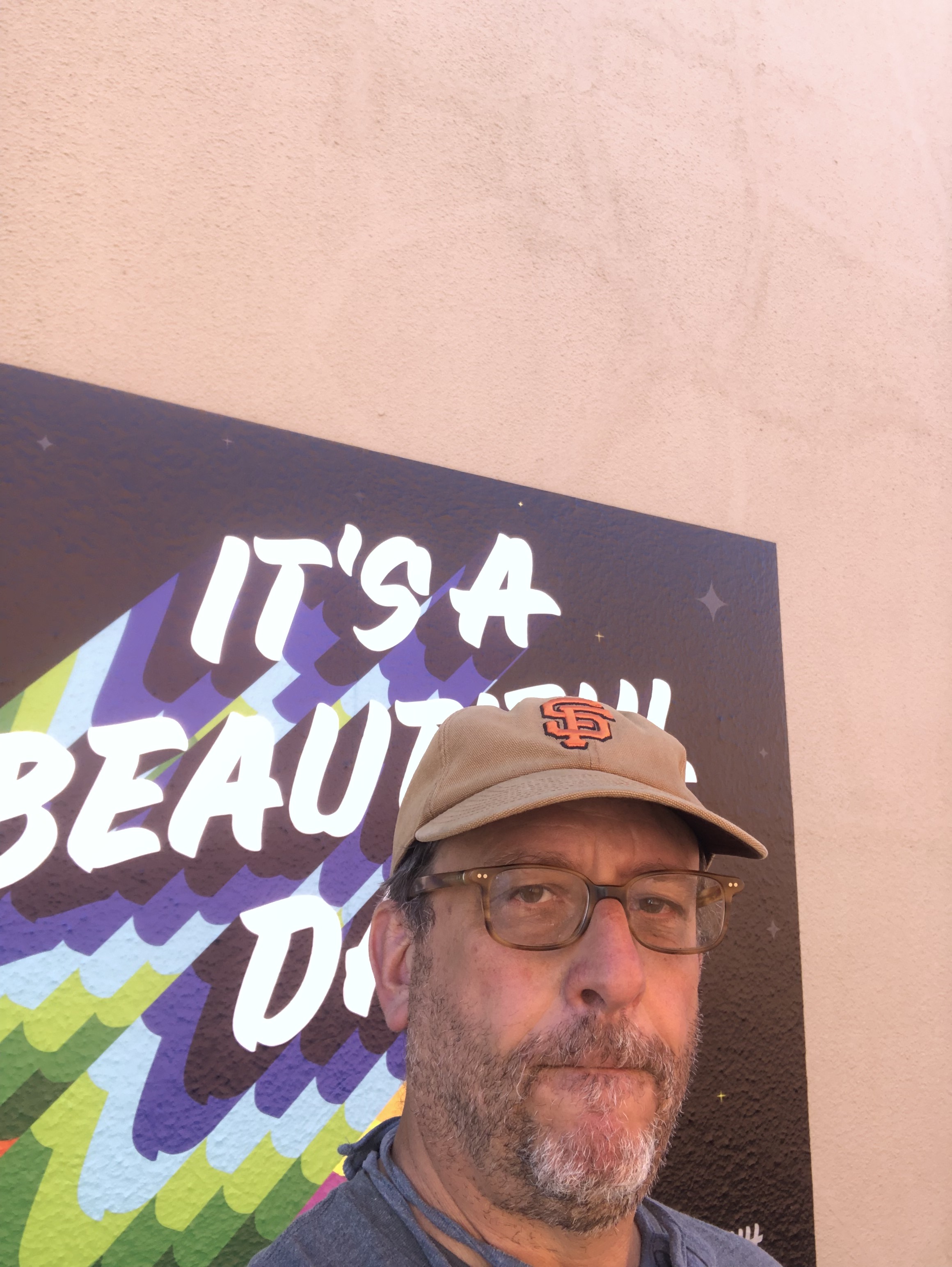 Maybe rather than playing in front of Zombie Runner facing Joanies to the west Steve Poltz will play on the cement pedestal where “Go Mama” the sculpture once was. There are about five works of art on Cali Ave, by Slim Soumah, a Korean guy, Michael Szabo, another Mural by Slim — there’s also a new temporary mural that says A BEAUTIFUL DAY. When I heard about the temporary mural, the one near Bell’s Books I called the artist and asked to send me 100 stickers of the same mural.