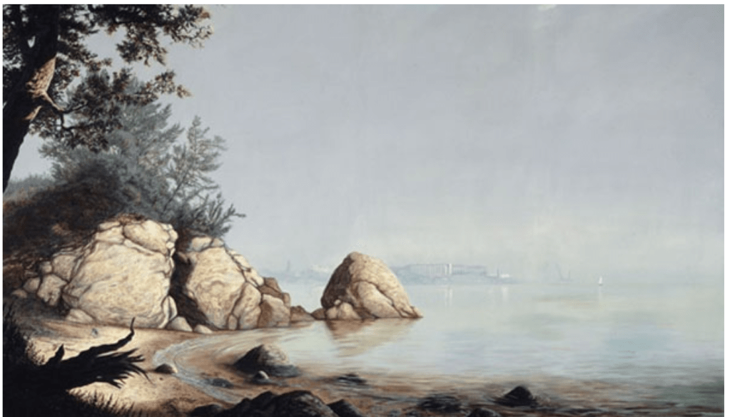 Sandow Birk San Quentin prison in fog and 39 other prison paintings perhaps at DeYoung