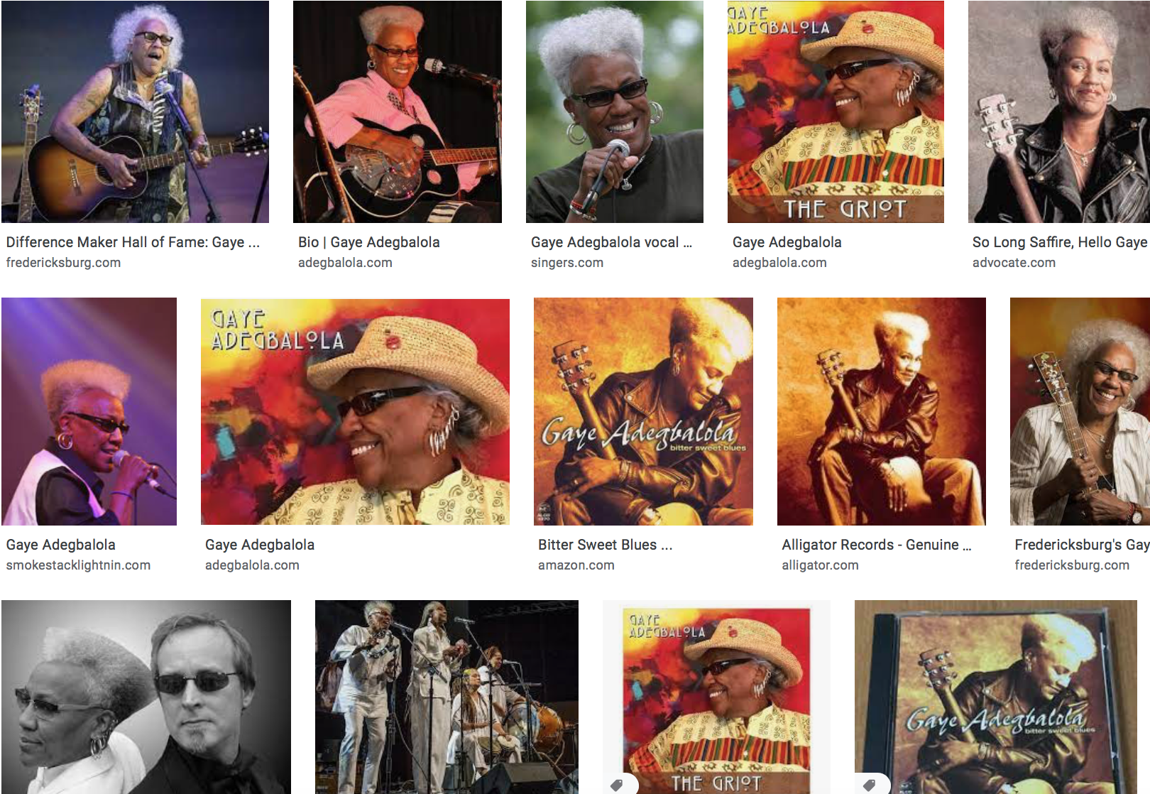 25. Gaye Adegbalola, former Saffire Uppity Blues Women founder or cofounder, recorded a song suite for Lions With Wings, “Tell Mamala” on Vizztone Records, possible Bay Area tour or residency; I met by cold calling her after noticing a section about her in Bruce Iglauer’s memoir;