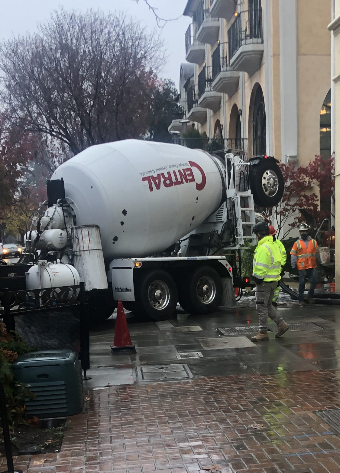 9) I noted Bradley Concrete pouring into the bowels of the former Hotel President Apartments. I read that Palo Alto already has more poured concrete than biomass — sum of humans, worms, plants and trees. And squirrels.