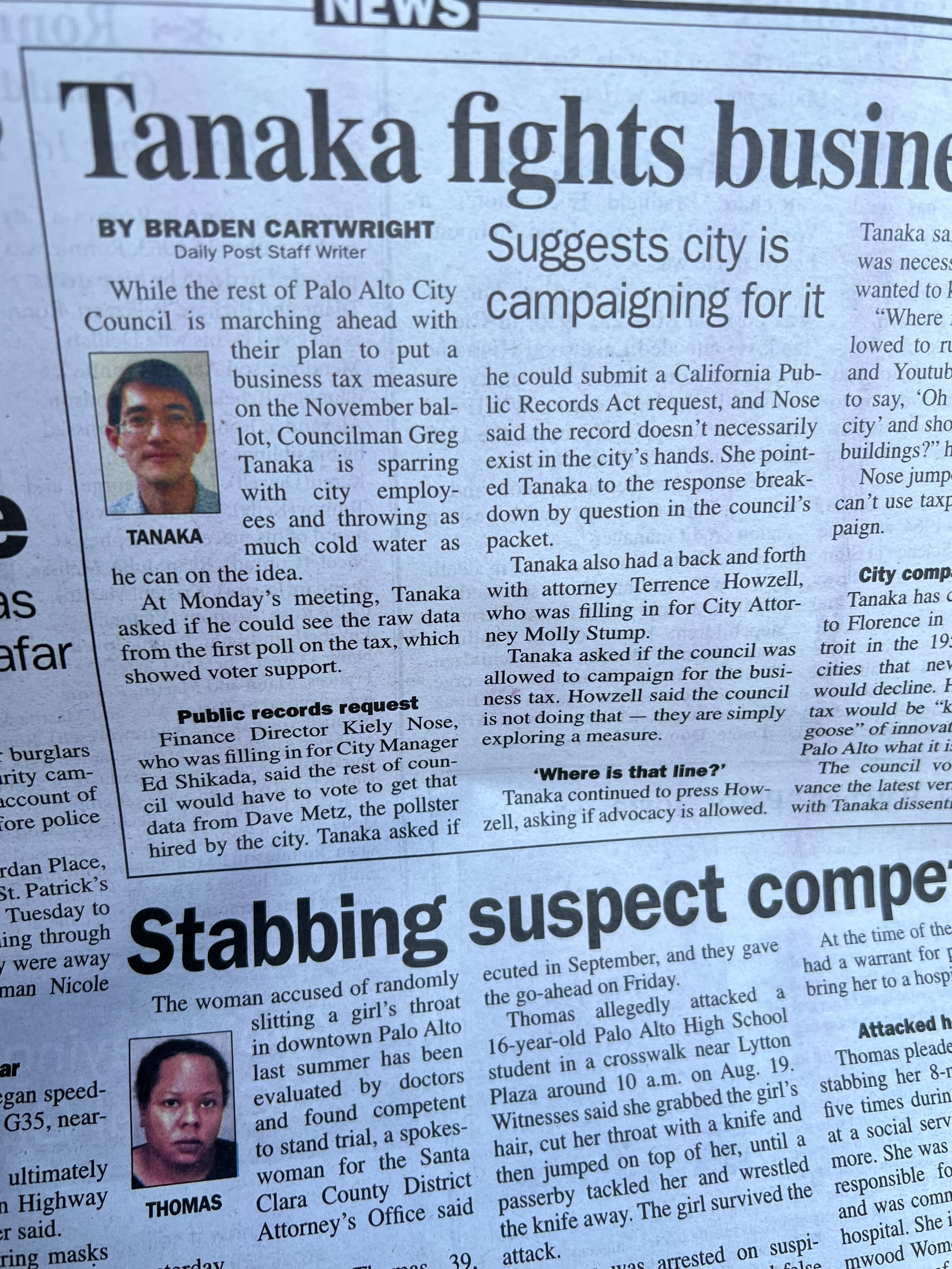 Greg Tanaka a technocrat who seems pretty much on the spectrum socially and is constantly seeing the most inane things and somehow Aspiras to Congress says he opposes the business tax except if it means having a greater police presence especially downtown to deter the underclass from either descent or crime or revolution; Distant it means having a different opinion decent goddamn this fucked up handheld changing my words he also Bragg during the campaign that he was close to the victims of the satanic night stalker Richard Ramirez